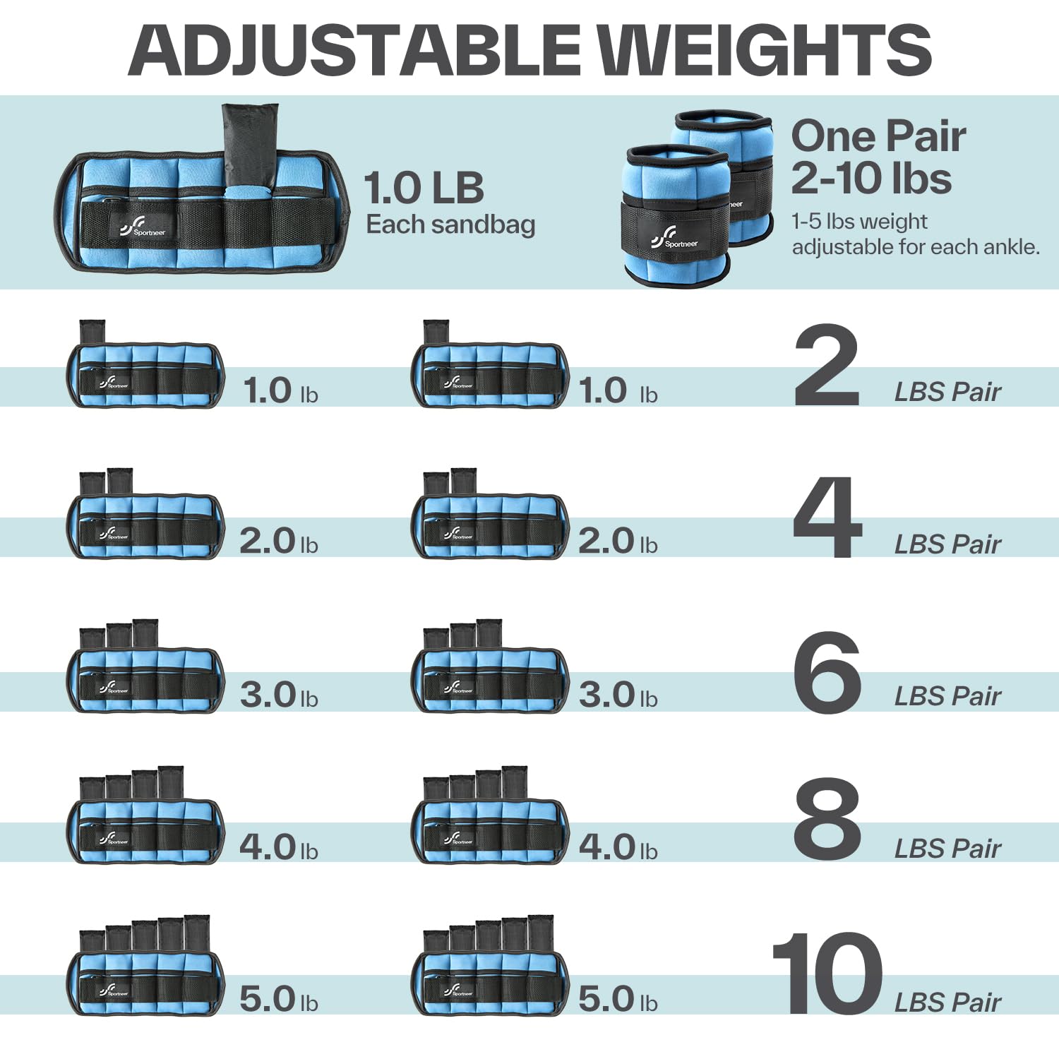 ADJUSTABLE LEG WEIGHTS: The sandbags for ankle weights are removable. Each single weight comes with 5 removable sandbags which weighs 1 LB. Each single weight can be adjusted from 1 to 5 lbs and one pair weights can be adjusted from 2 to 10 lbs by adding or reducing the sandbags