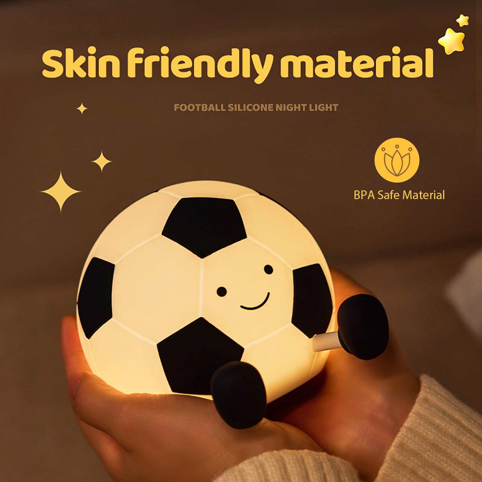 [ Adorable Soccer Design ] : Soccer night light is shaped like a cute soccer character with a charming smile and little feet, giving it a playful appearance. The soccer gifts for boys looks like it's sitting and saying hello, making it irresistibly charming for both adults and children. Soccer light's extended legs can even double as a smartphone holder for convenient video watching.