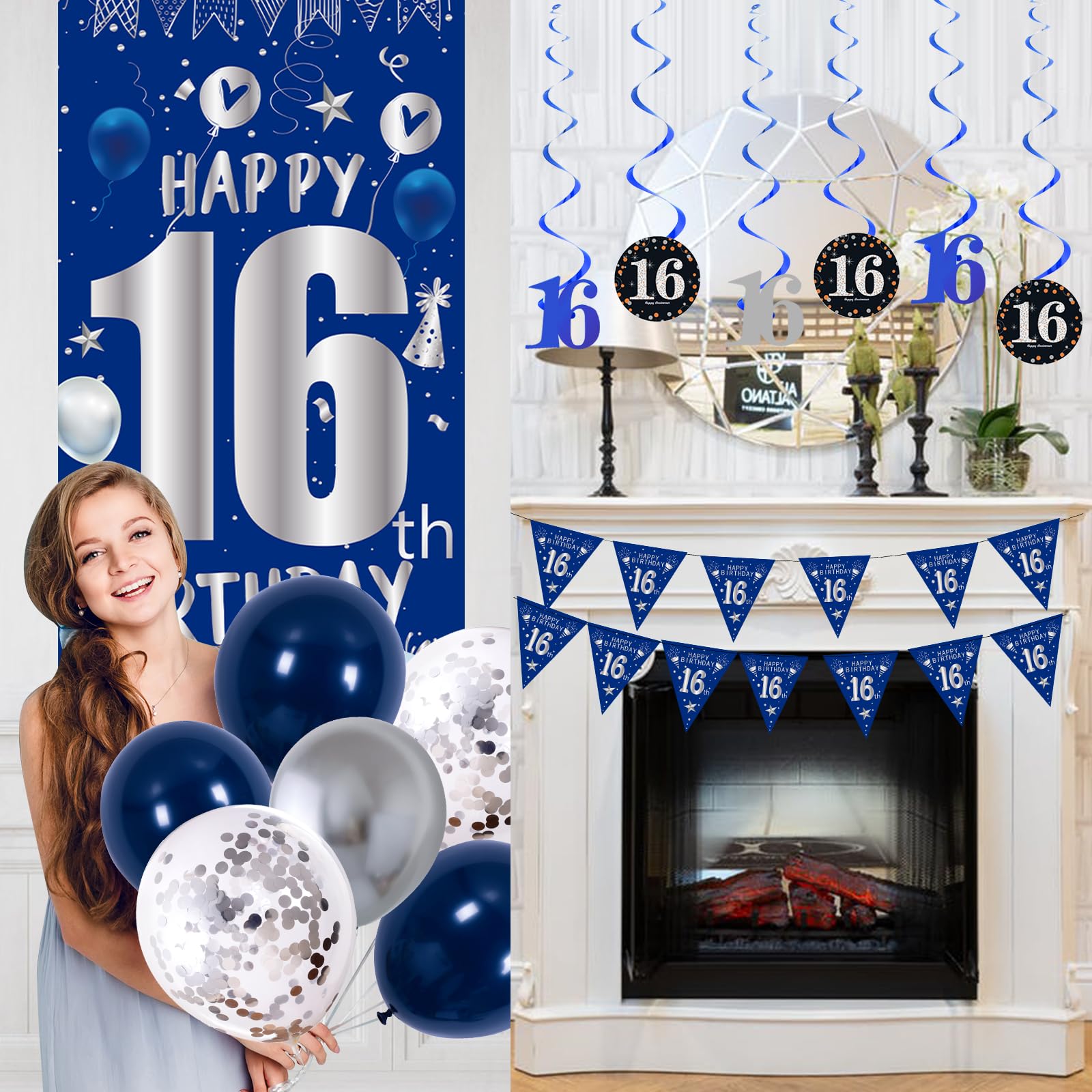 🎉【What You Will Get】This blue and silver birthday decorations party supplies are designed for 16 year old boys and girls birthdays. Package list: 15x navy blue latex balloons, 10x silver confetti balloons, 6x silver latex balloons, 6x blue hanging swirls with number 16 pendant, 1x blue silver "HAPPY 16th BIRTHDAY" door banner, 1x blue silver 16th birthday tablecloth, 1 set x number triangle flag banner, 1x dot sticker, 1x ribbon.