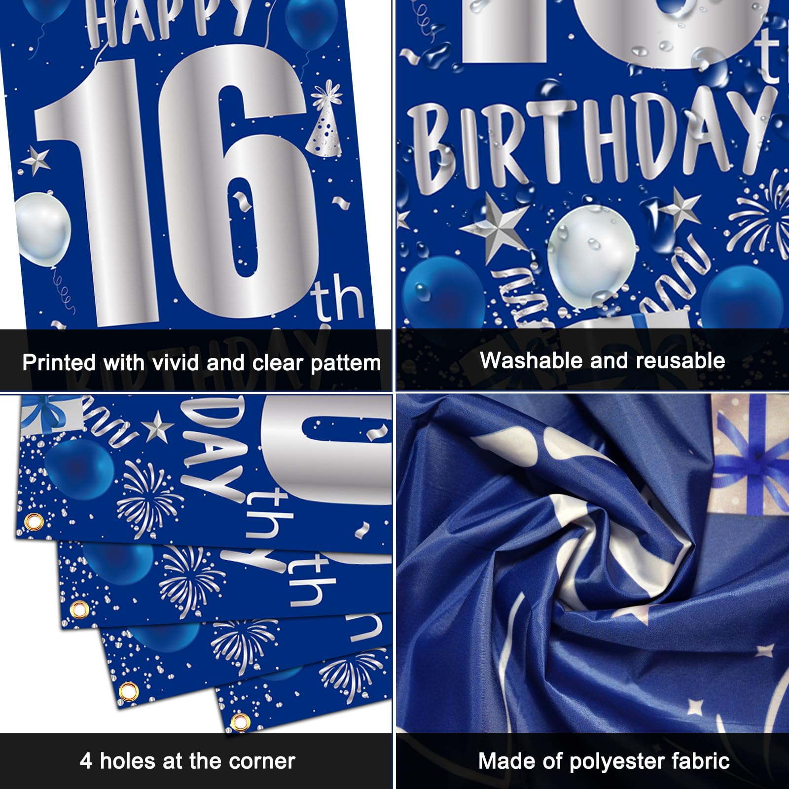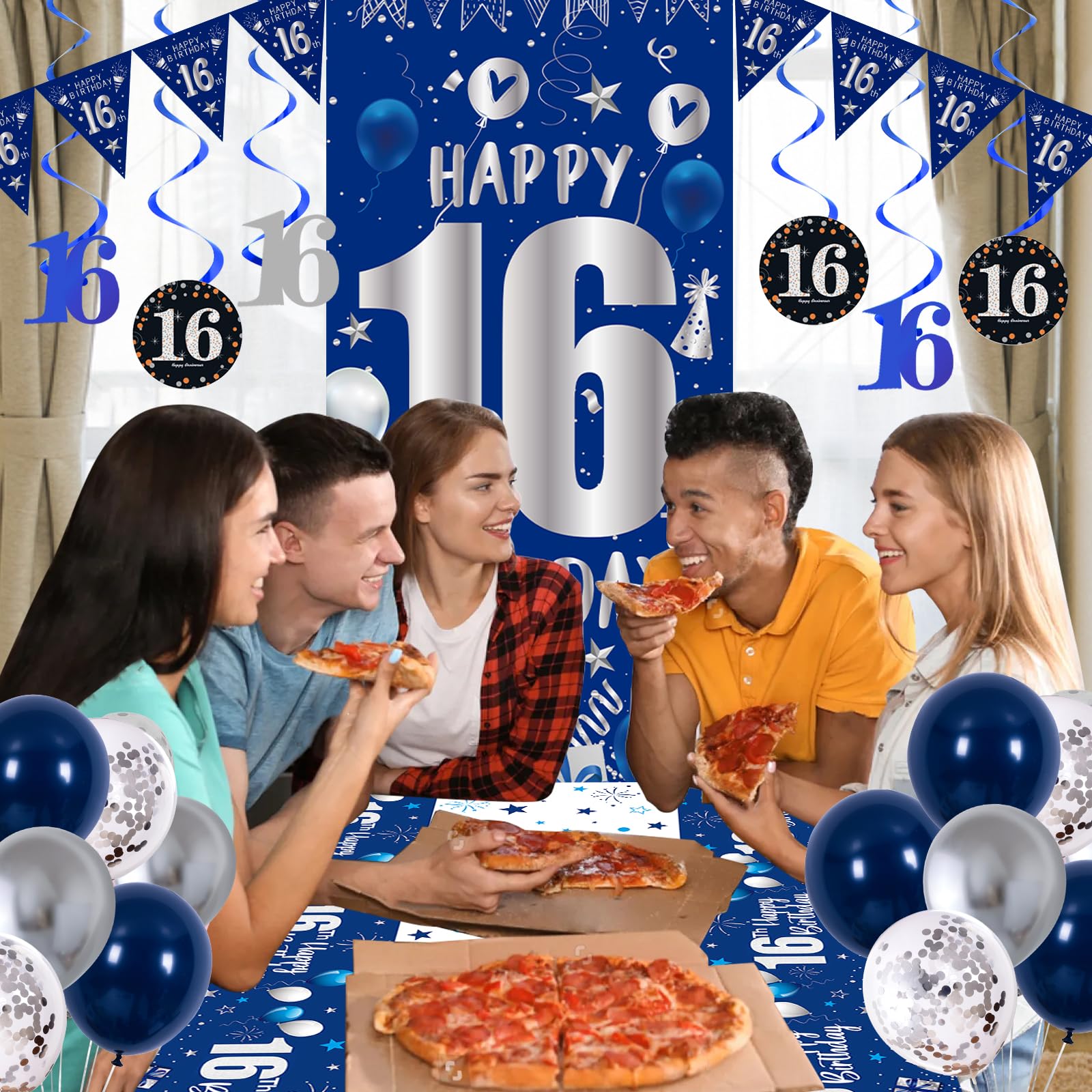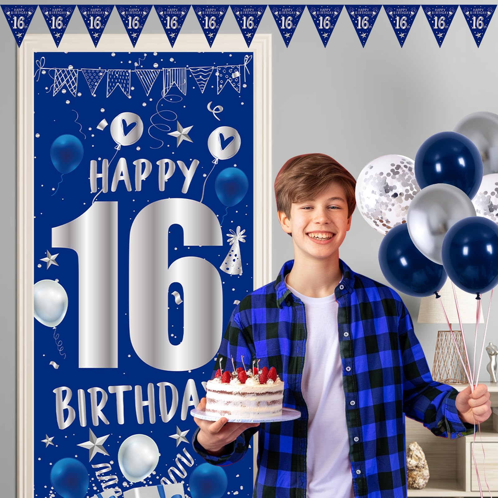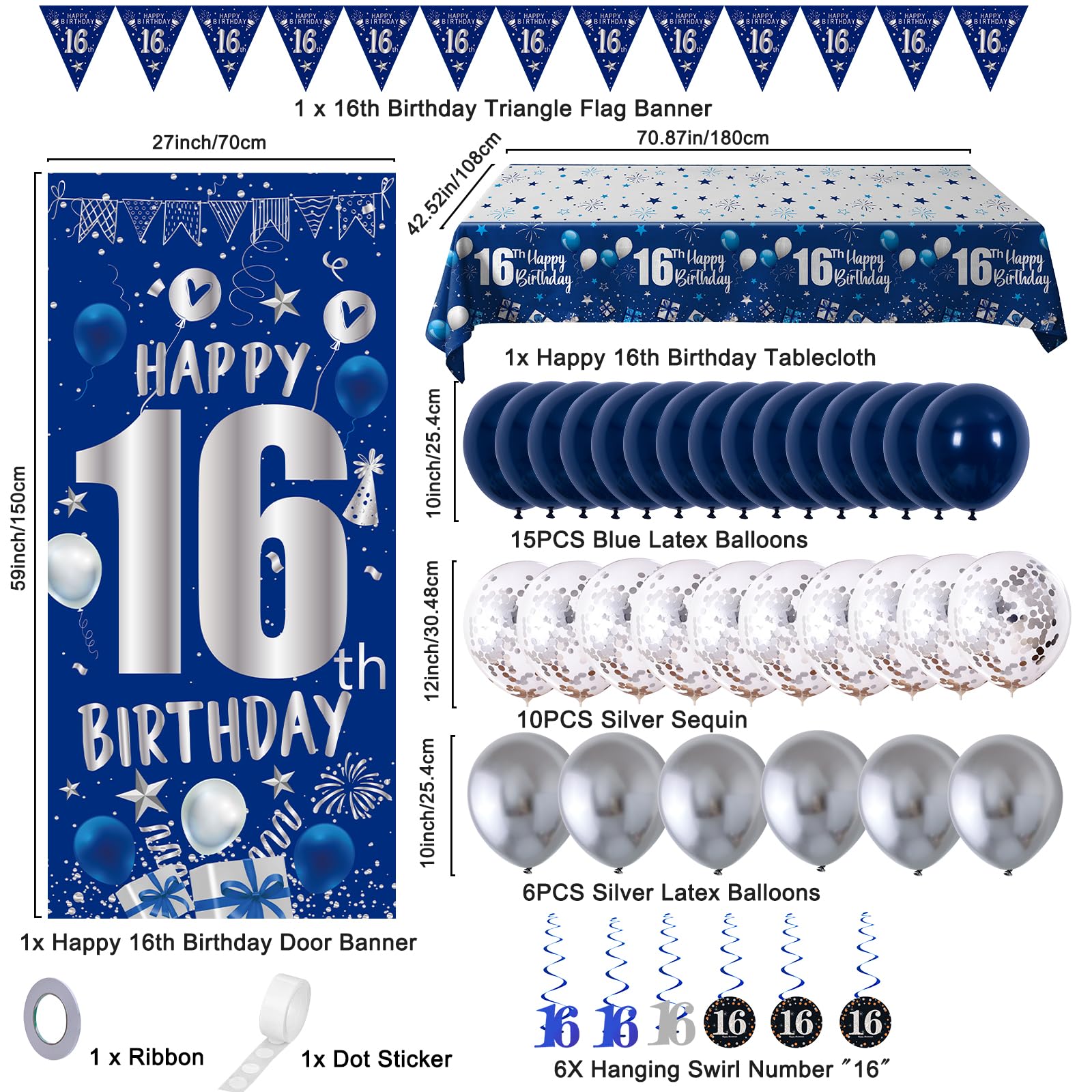 💙【High Quality, Safe & Durable】The 16th birthday decorations balloons for boys are made of high quality thickened latex material, pressure resistant and durable, not easy to burst, can be used for a long time. The silver "Happy 16th Birthday" sign printed on the tablecloth, triangle flags, and birthday door banner is bright and colorful and won't fade easily.