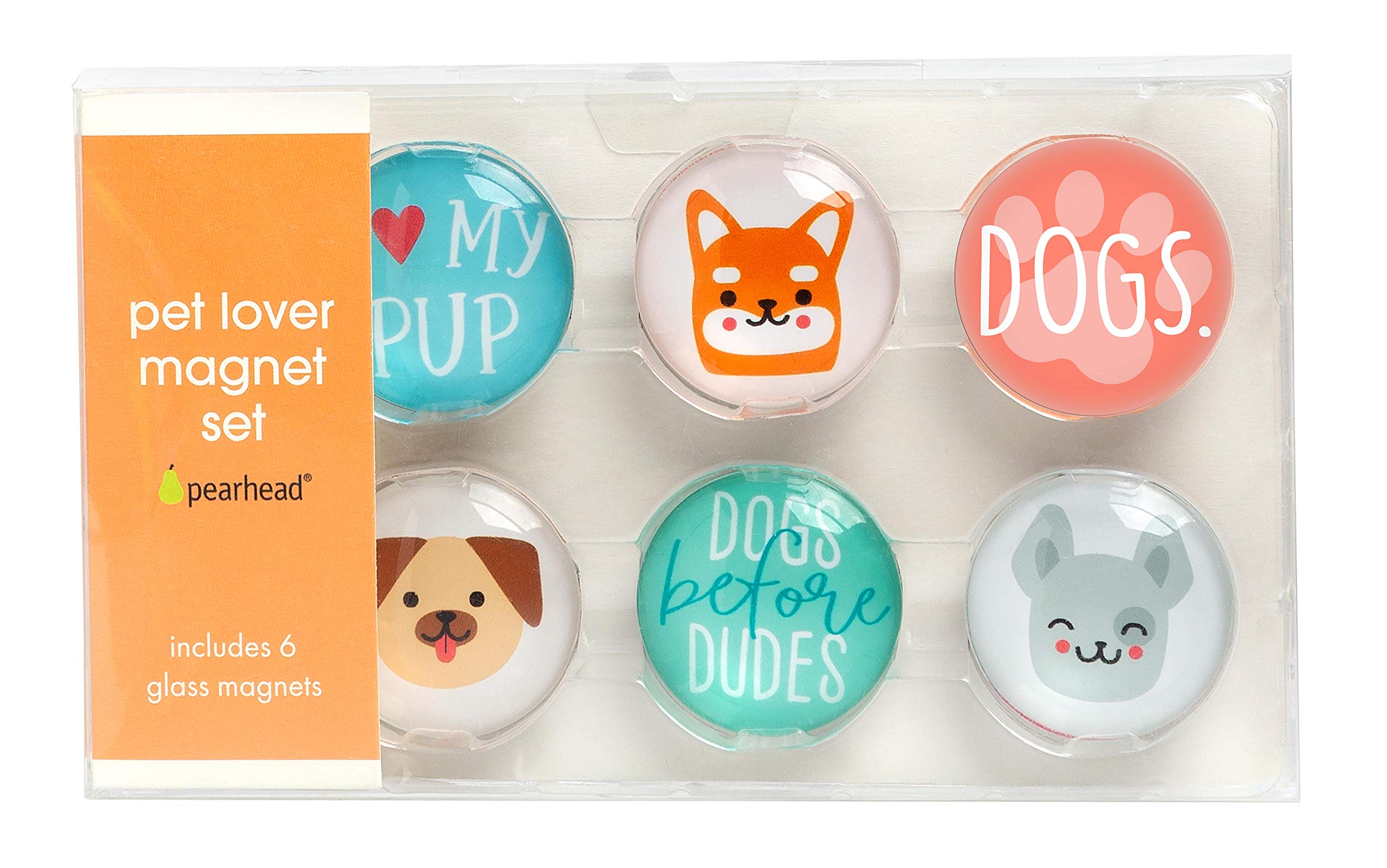 This set includes six magnets with various dog themes graphics and quotes like “dogs before dudes”