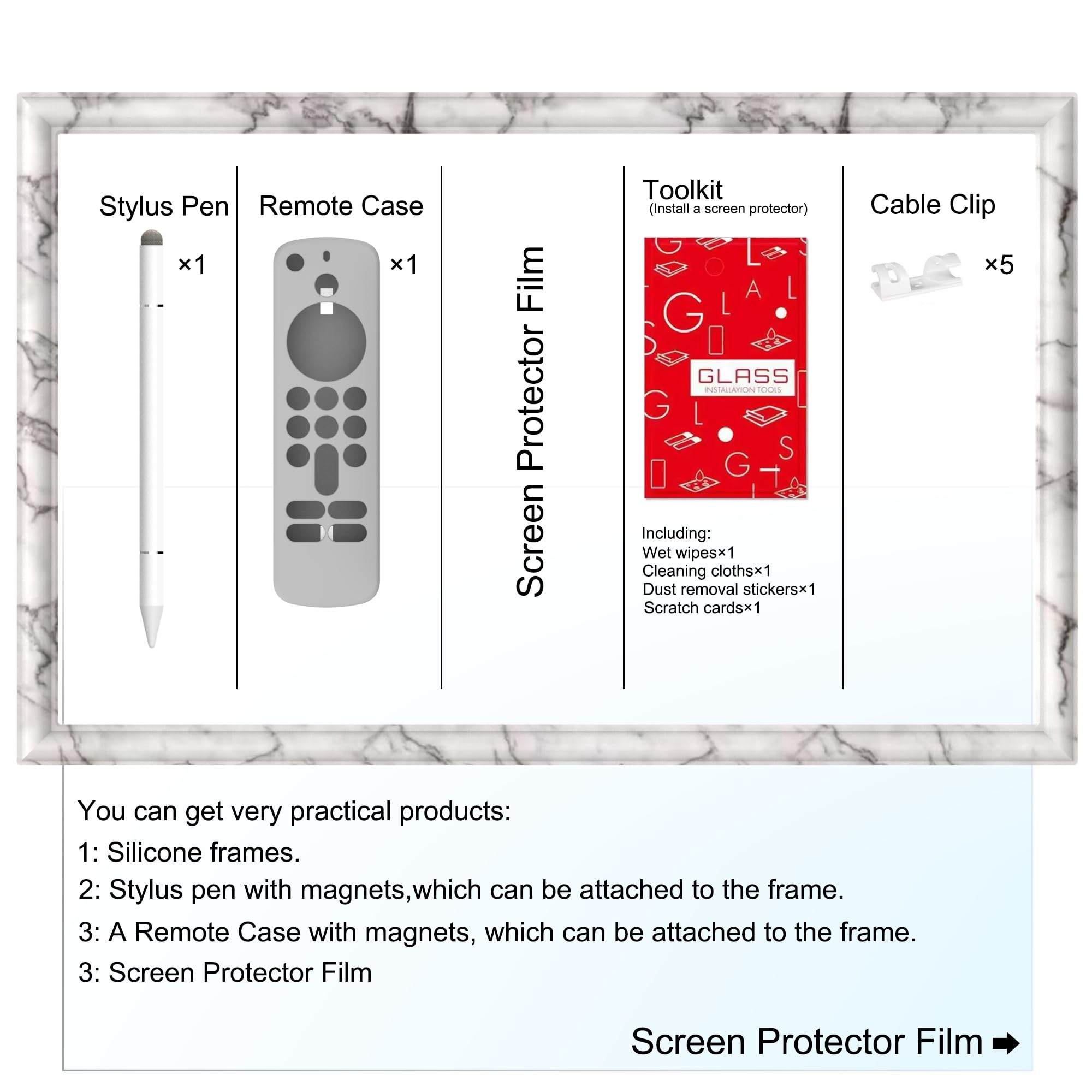 3. Besides the frame, there is also a touch-sensitive stylus, a protective case for the remote control, and a high-definition screen protector. There is also a toolkit for installing the screen protector. Finally, there is some clips for fixing the power cord.Make the power cords look neat and orderly.