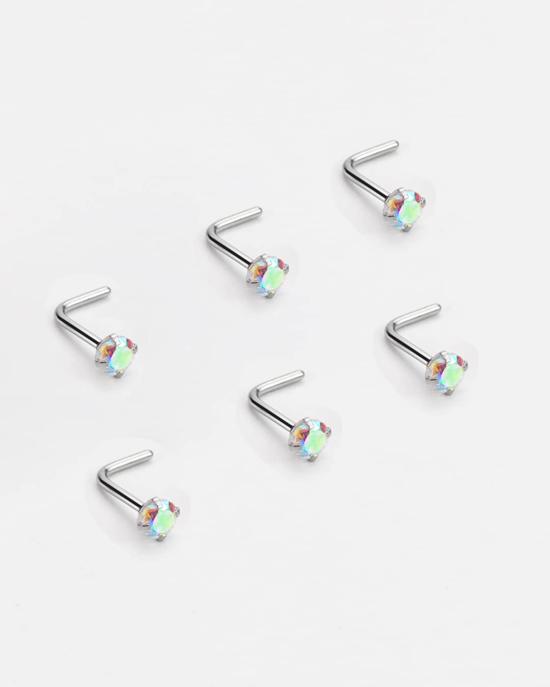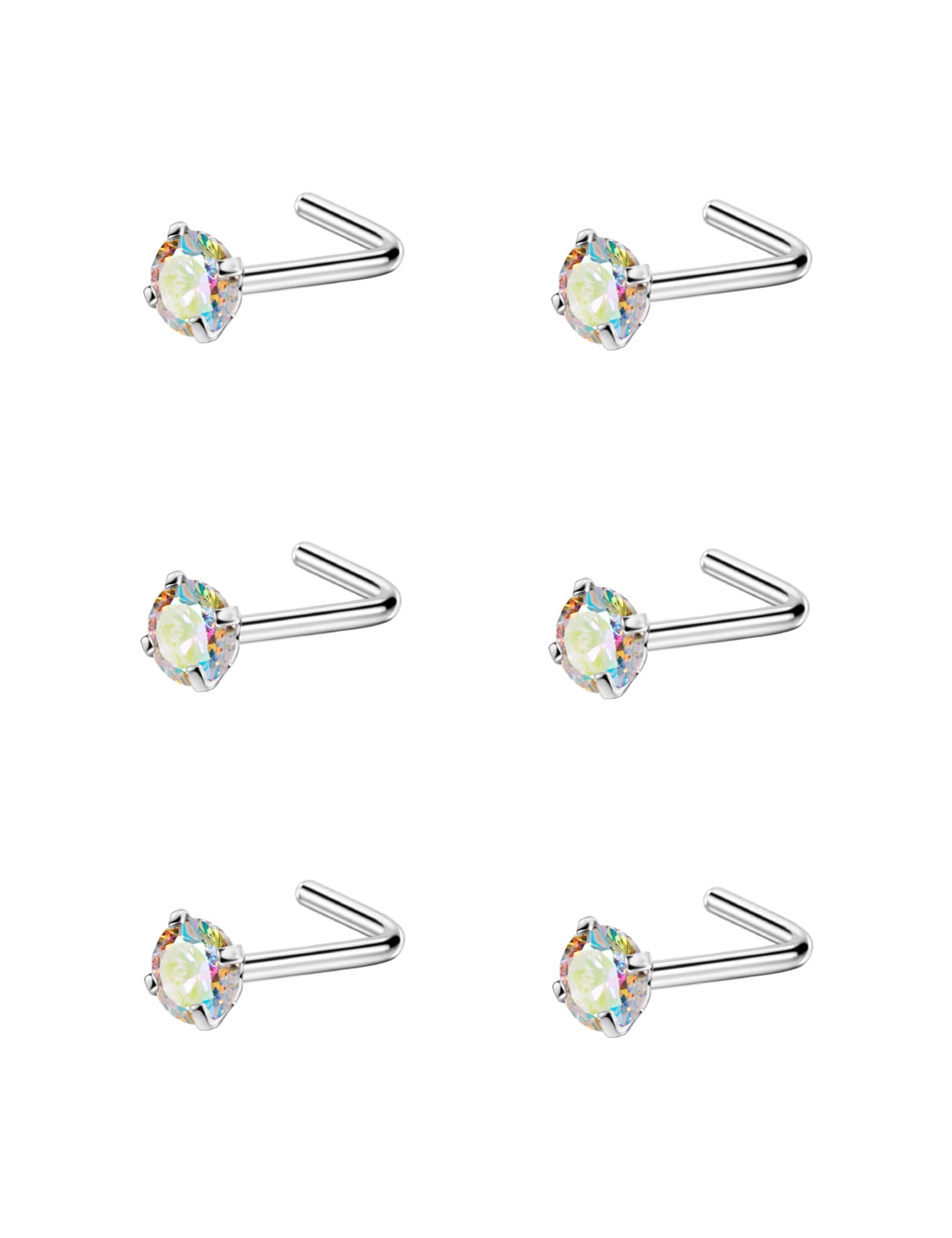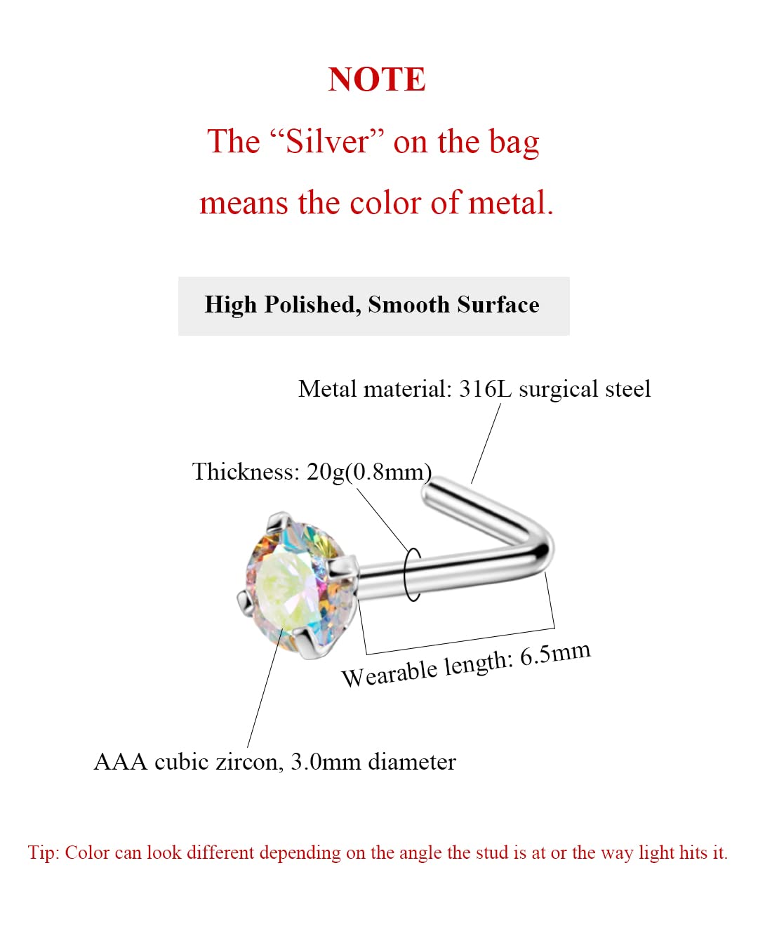 This basic L shaped nose rings studs for women measurement: 6.5mm wearable length and prong set AB round cubic zirconia measures 3mm in diameter. The wire thickness measures 20 gauge (0.8mm).