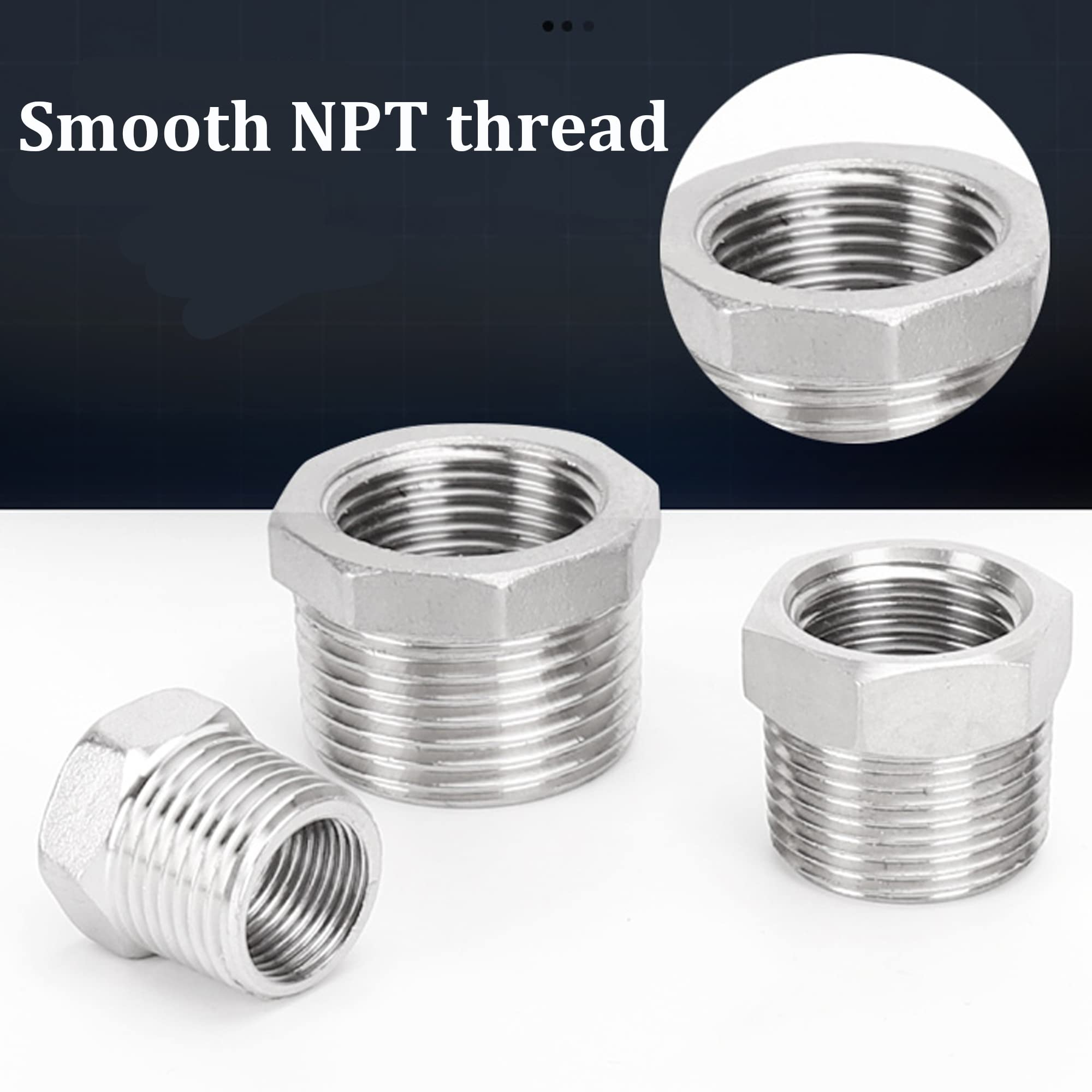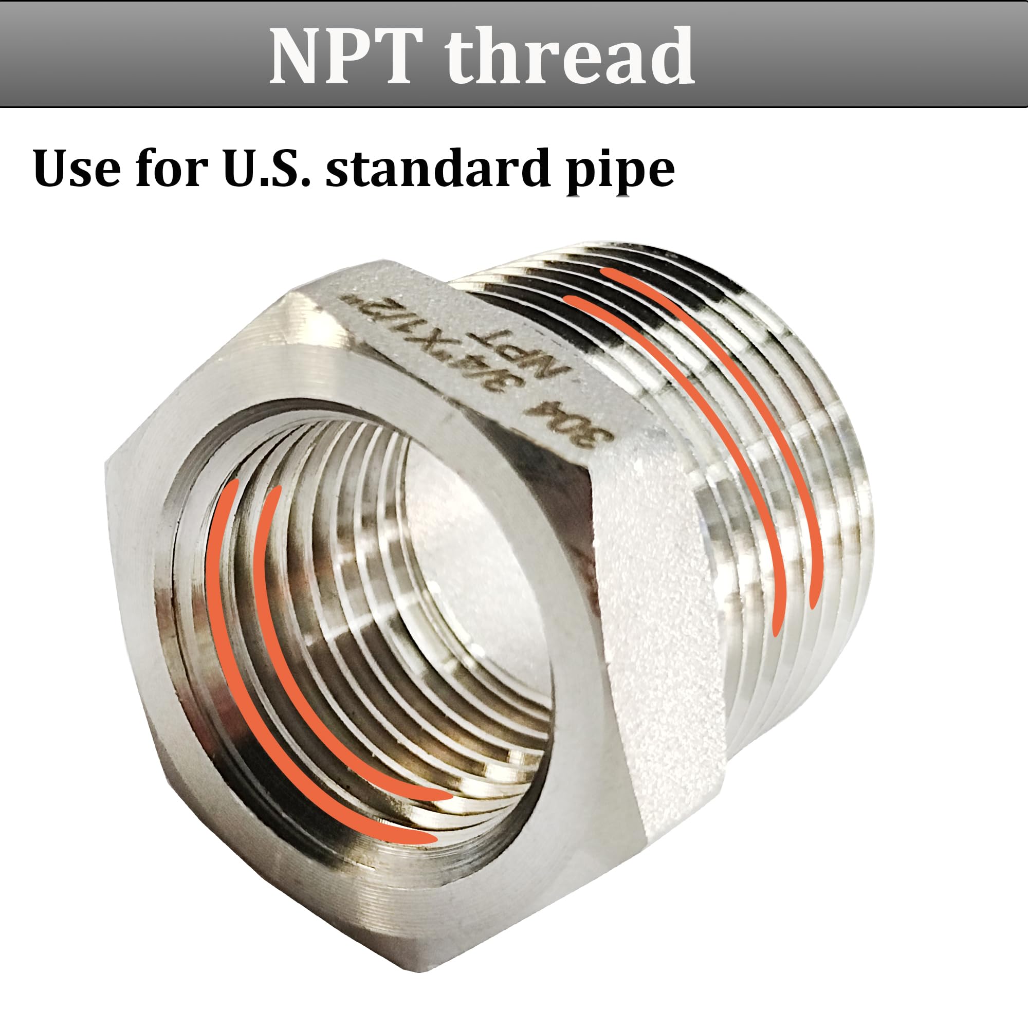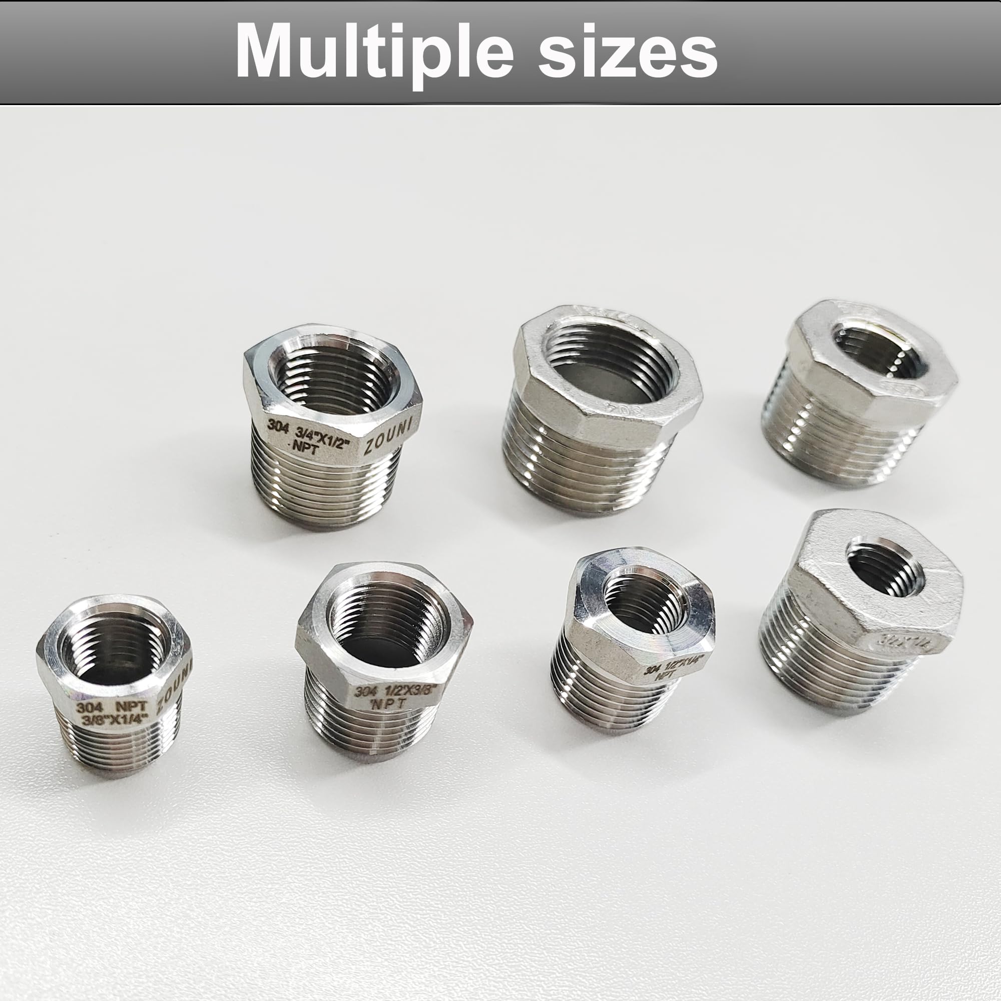 NPT THREADED: ZOUNI hex bushing is an American standard NPT threaded interface. It is an inner and outer threaded pipe fitting that connects two pipes with different diameters. It has an irreplaceable role in pipe connection. The pressure requirements are not high.