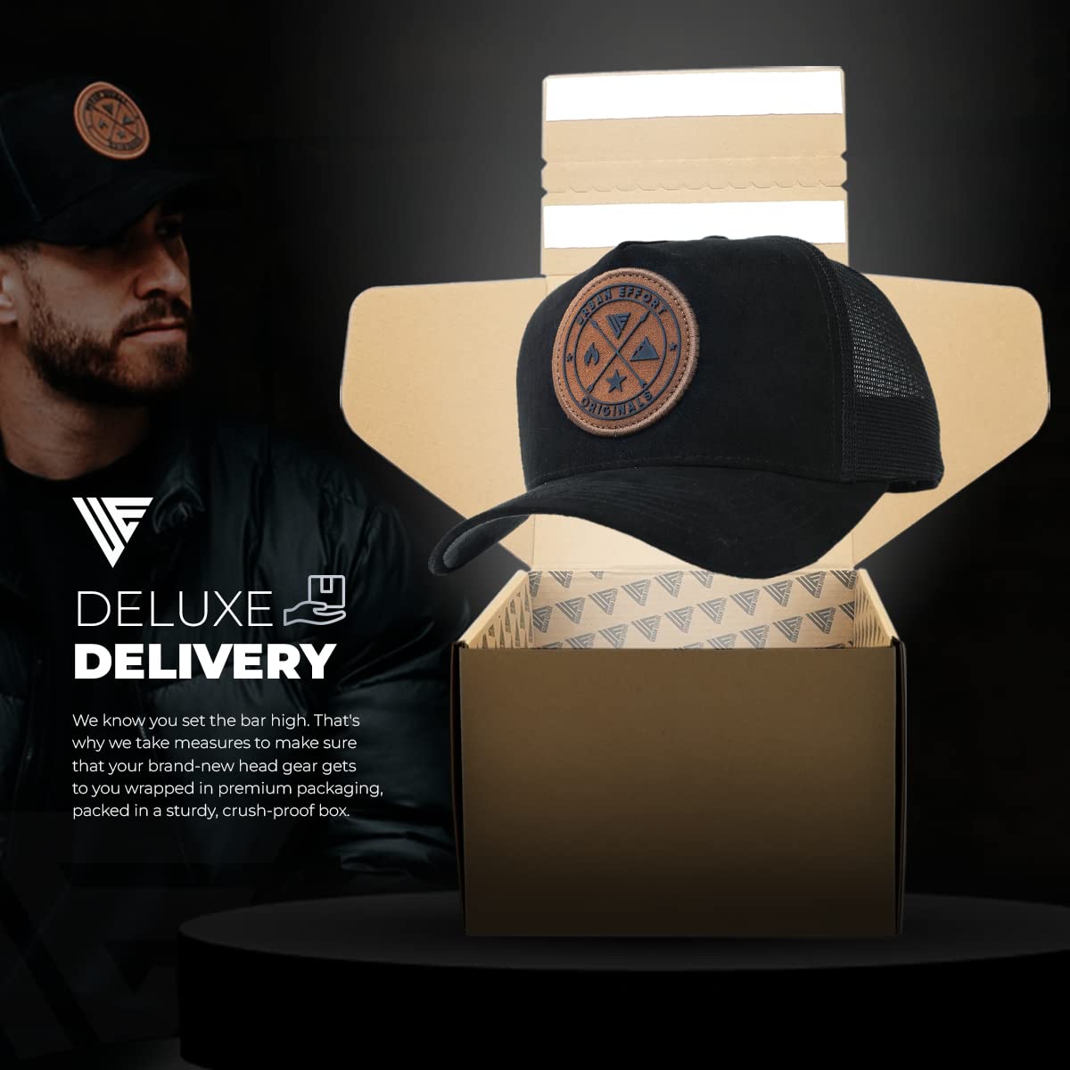 Packed with Care: A premium custom trucker hat that comes packed in an elegant gift box, to make sure it arrives safely at your doorstep, whether as a new addition to your collection or as a gift for your loved one.