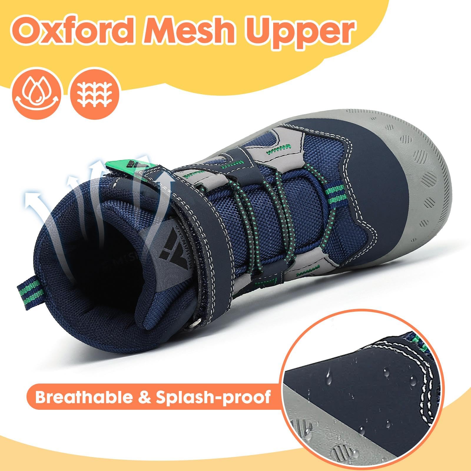 COMFORTABLE UPPER: The Vamp of kids hiking shoes are featured with high-quality PU leather and breathable mesh fabric, which keep kids feet dry and comfortable feeling.