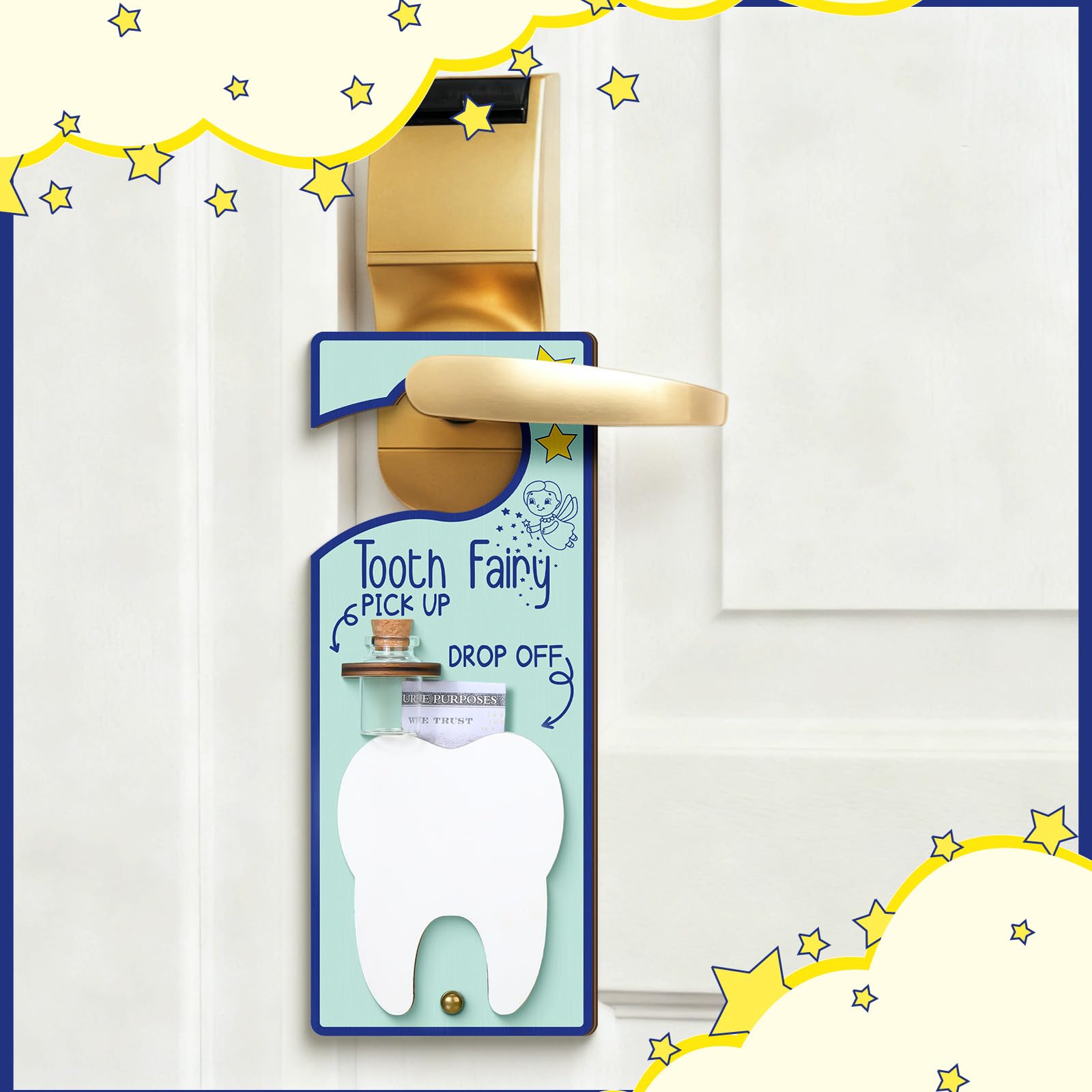 Durable Material Construction: this tooth fairy door hanger is made from wood material, offering durability and strength; Offering an exquisite feel while ensuring the safe storage of your child's precious teeth; The bottle is made from glass and features a wooden cork, contributing to the set's overall classic design