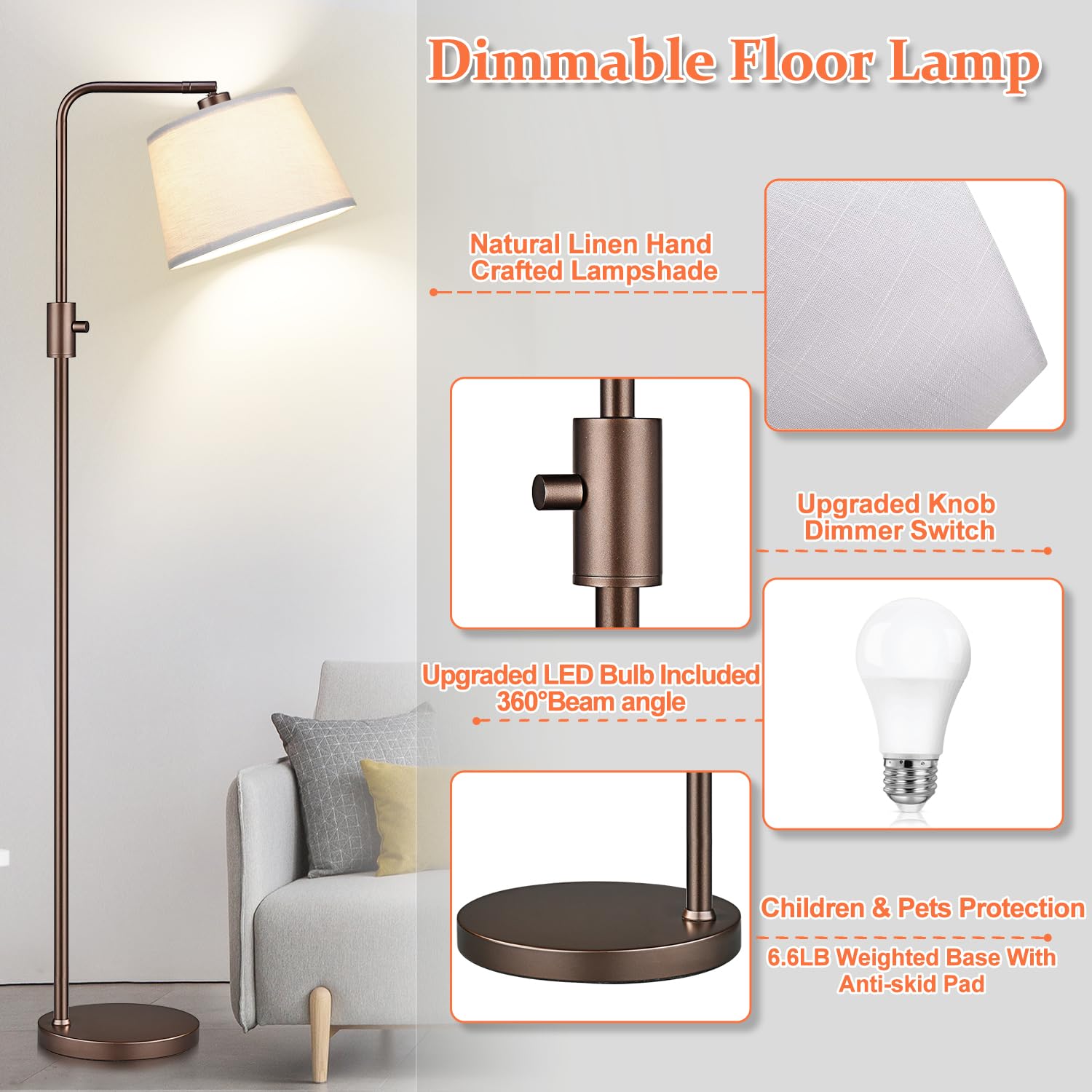[Sturdy Safe Heavy Base & Long Power Wire] - Built with sturdy metal material, our living room standing lamp is sturdy and tip-resistant, not easy to bent and fall down. This floor lamp has an excellent stability which will prevent falling when it's knocked by kids or pets. 5.9FT cable allows you to place the tall bedroom lamps in any place you want.