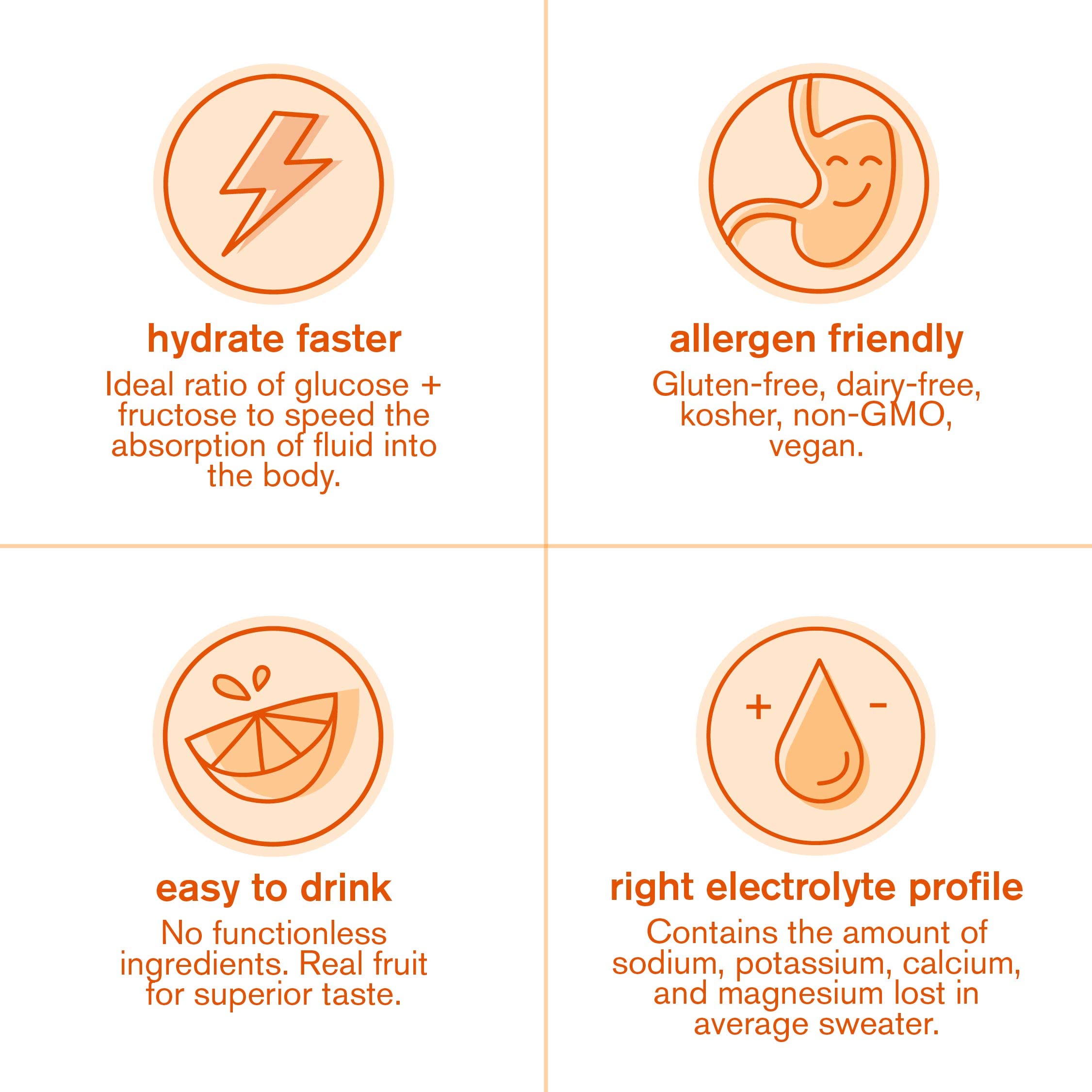 ORANGE: Vegan, plant based, verified non-GMO, gluten free, dairy free and Kosher. Only real fruit used for flavor and a light, refreshing taste. 50% less sugar and 2x the sodium of the leading sports electrolyte drinks*