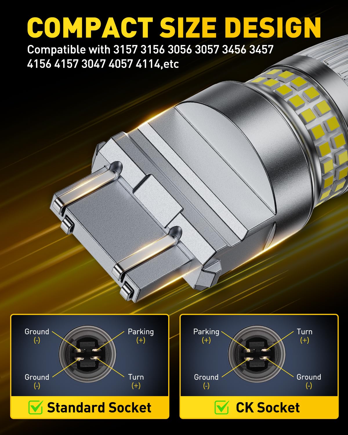 5 Mins Easy Installation:Non-polarity design fits US standard and CK sockets, perfectly fits 3157, 3156, 3056 3057 3757 4157 4156 3457 3047 4057 4114 socket types. Suitable for car backup lights, reverse lights, tail lights, brake lights, turn signal lights, parking lights, daytime running lights, and so on. Even beginners can finish installation in 5 minutes by directly replacing the original halogen bulb. (Please confirm your car’s bulb model before purchasing).