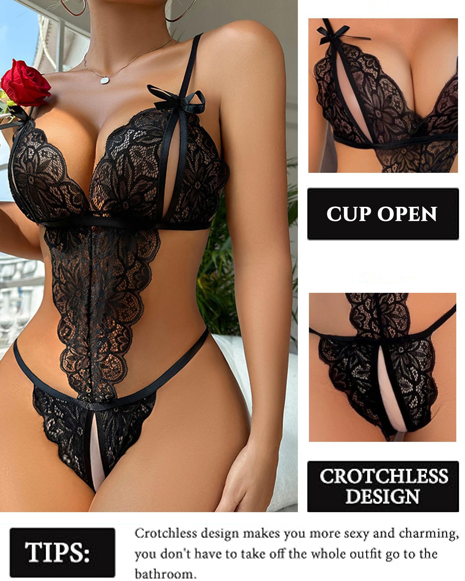 Adjustable Strap: This bodysuit lingerie adjustable shoulder straps ensure a perfect fit,Crotchless style bottom with movable strap on the back.Bow accents add sophistication to this lace jumpsuit.