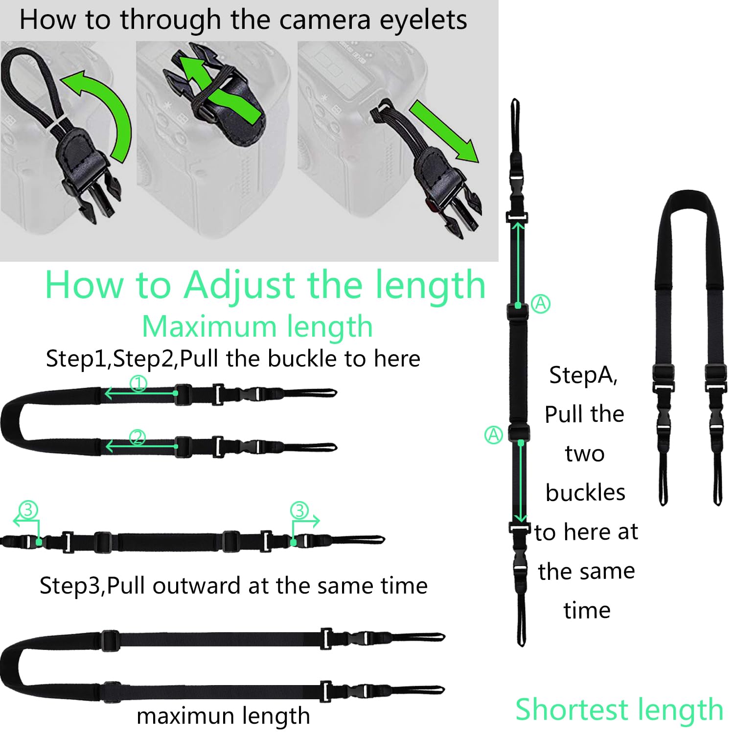 Adjustable Length:Adjustable length on both ends for all photographers at different heights.Strap Width:1.5 inch/ 3.8 cm. Strap Length:44 inch-56 inch/111 cm-142 cm
