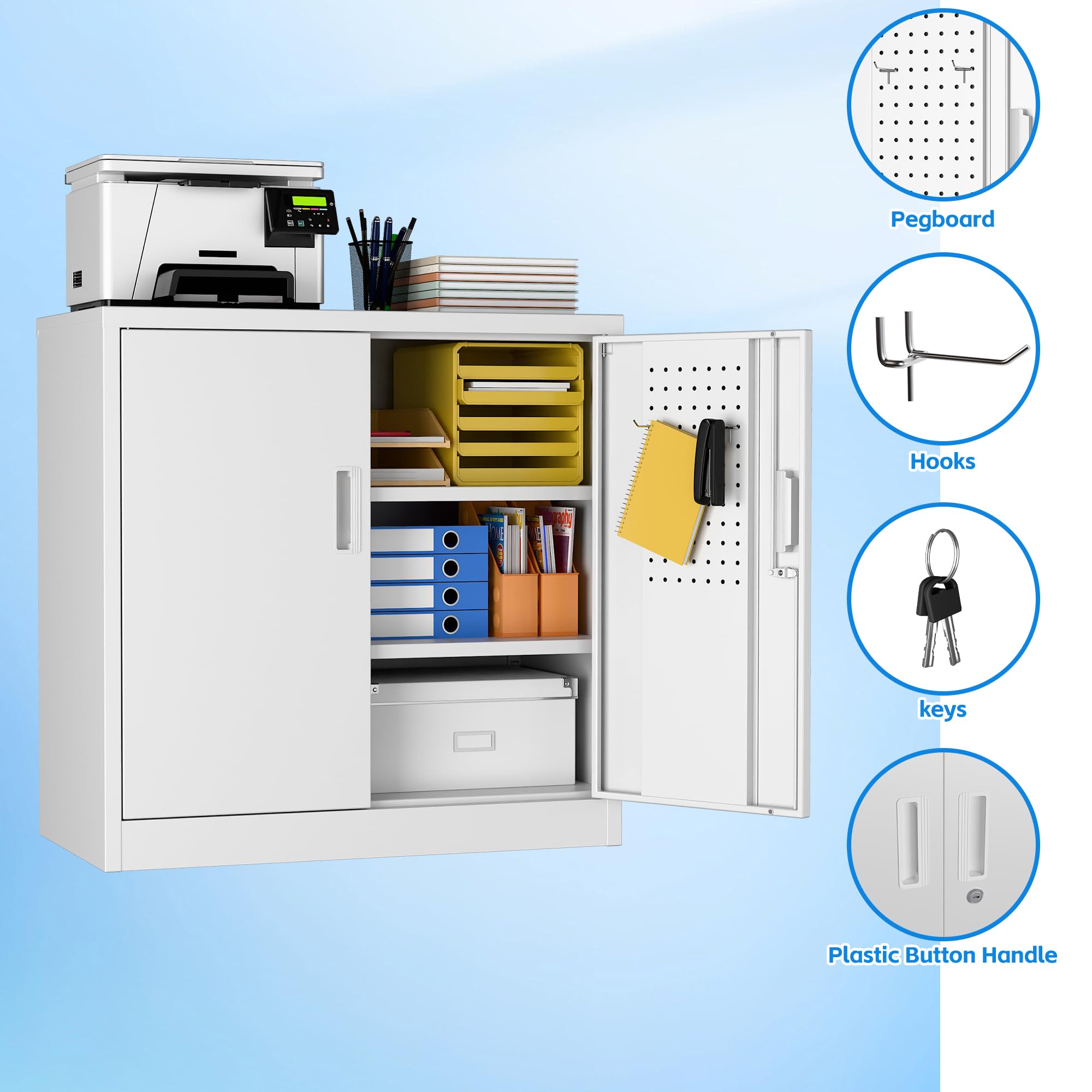 【Storage Cabinet Size】Office cabinet size: 31.5"W x 16.5"D x 31.5"H; Whole-in-one reinforced heavy-duty metal frame, solid and strong.
