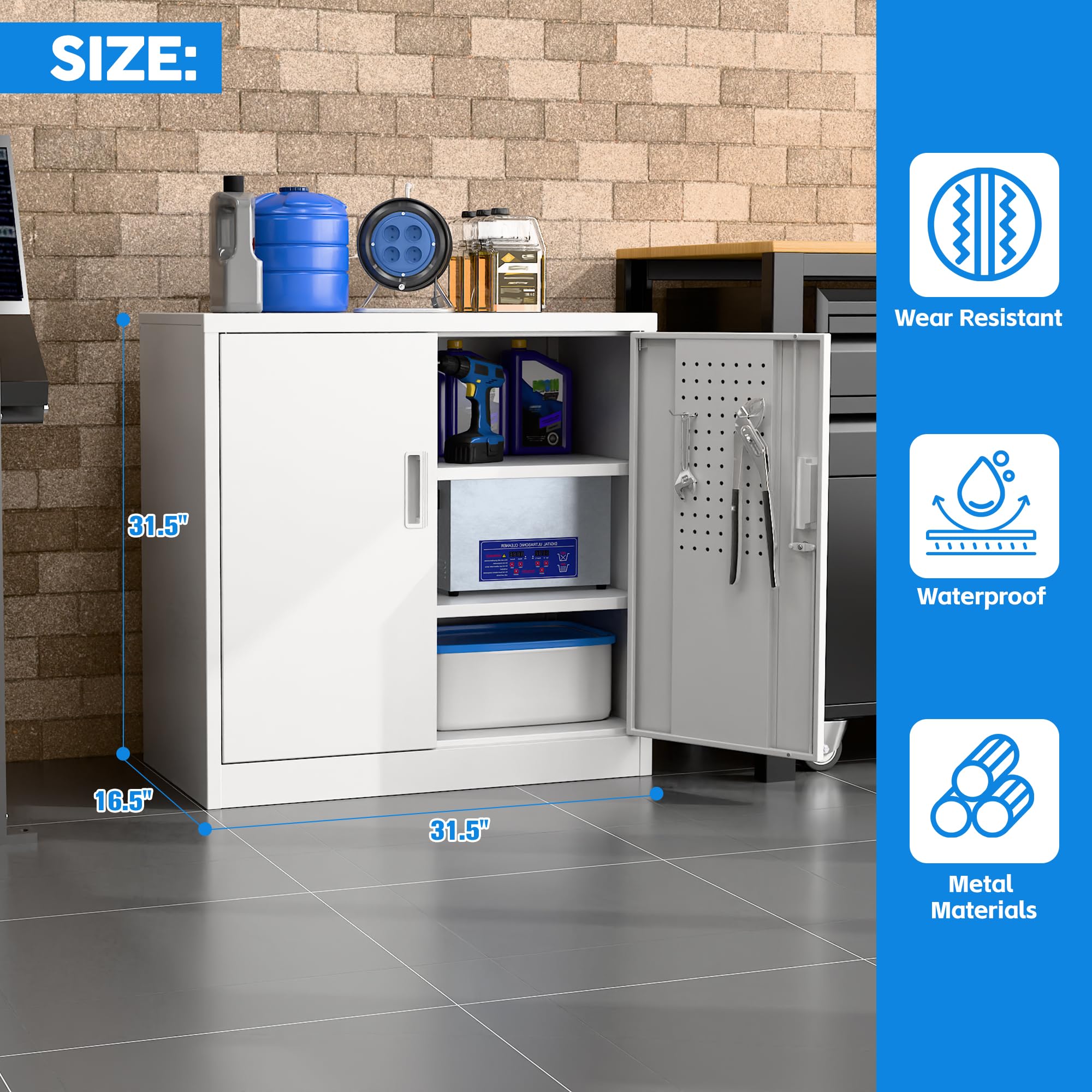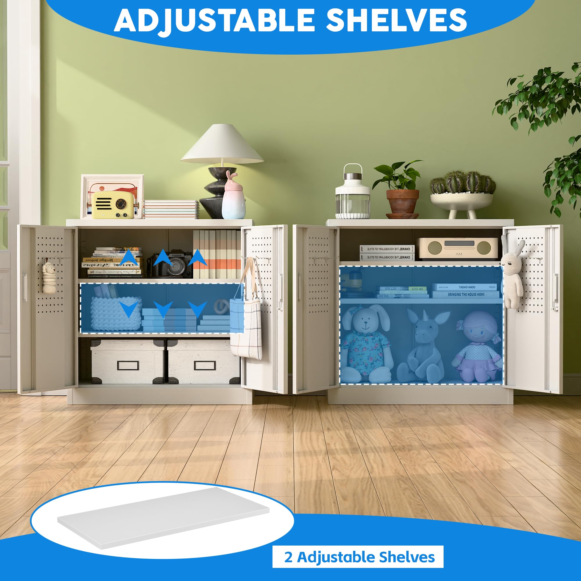 【Multi-Function Use】This storage cabinet can be used in the garage, office, home, and kitchen, with 2 height adjustable shelves, suitable for many areas.