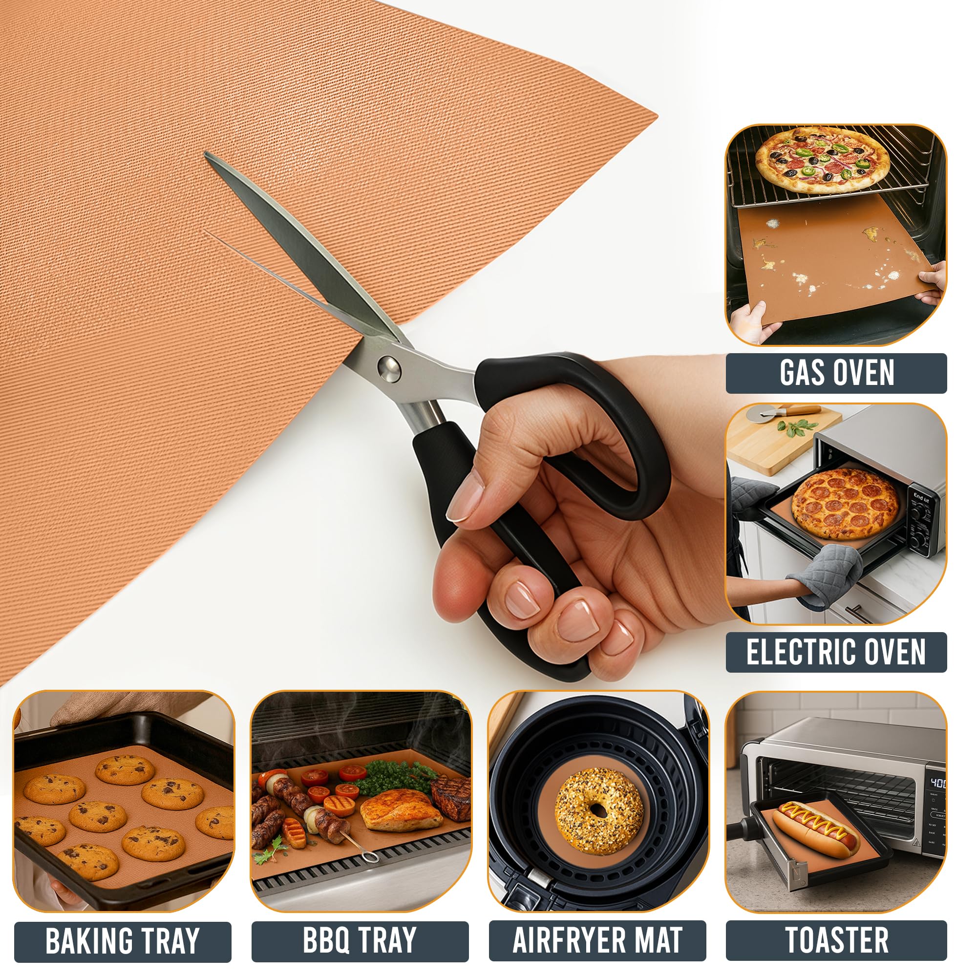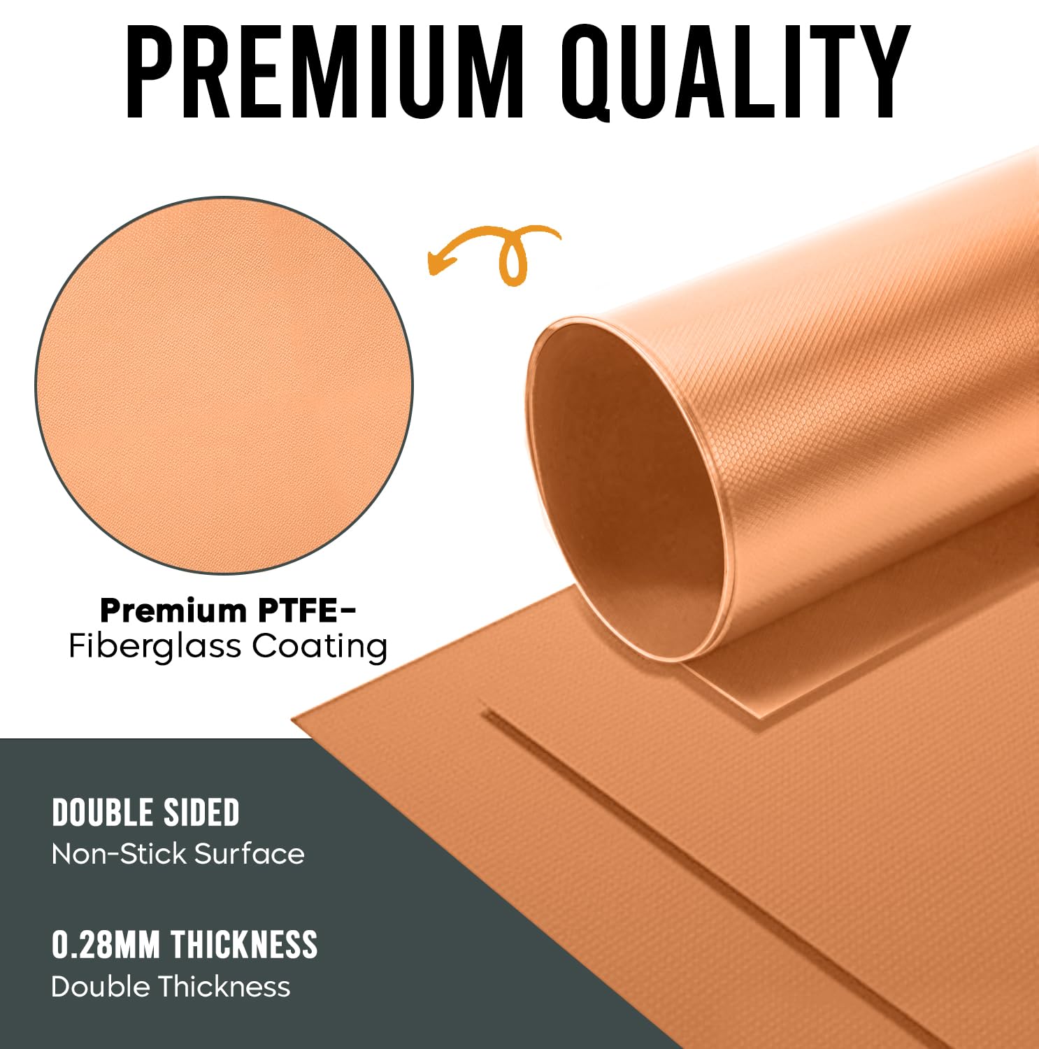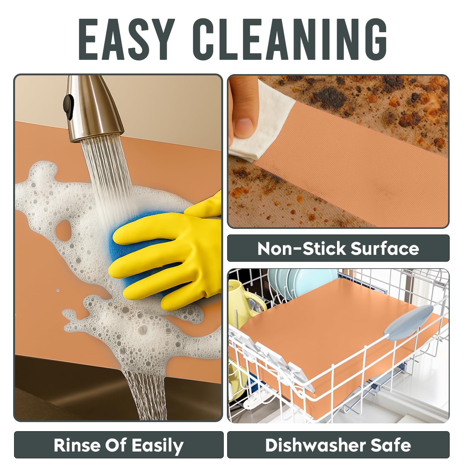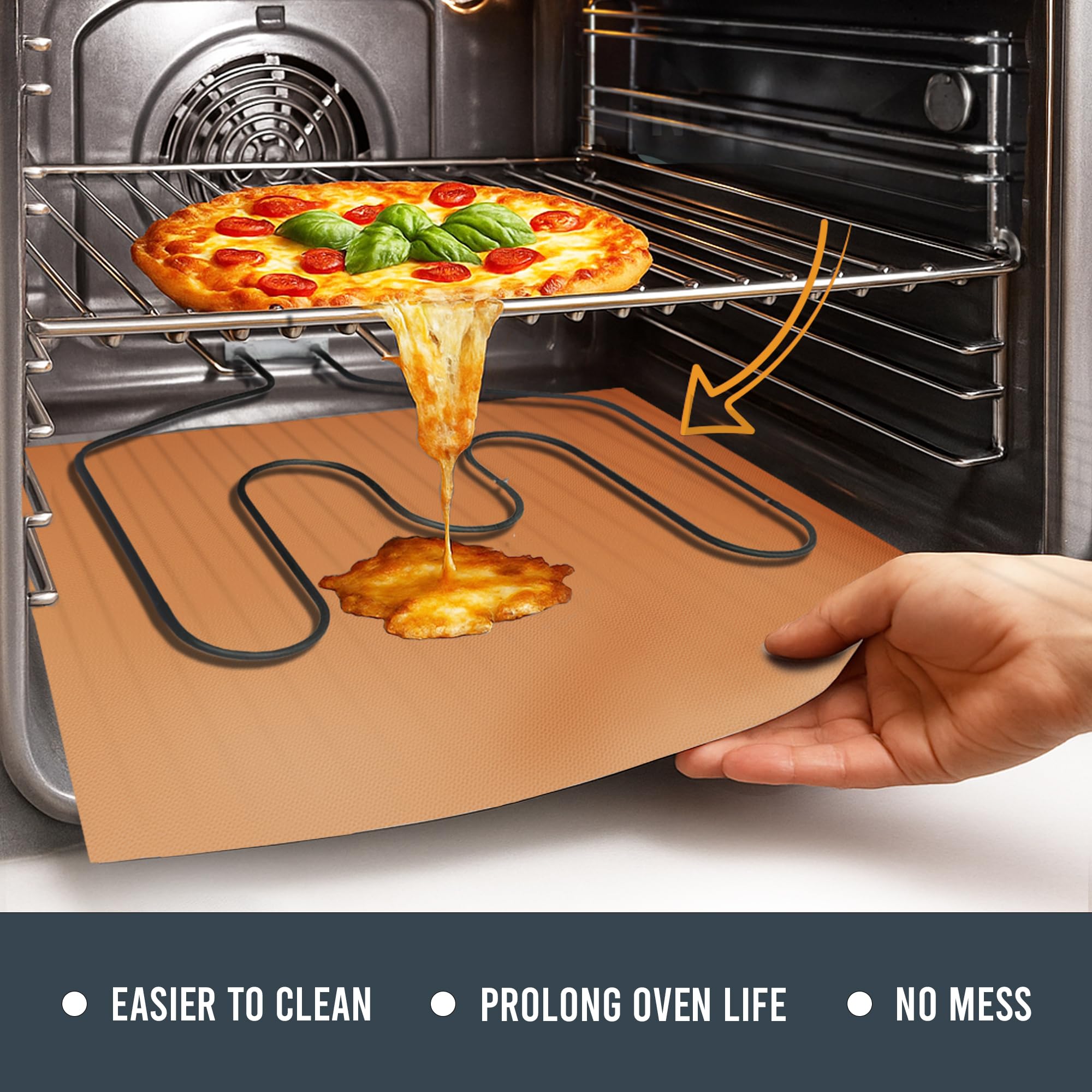 PREMIUM QUALITY & SUPERIOR DURABILITY: 3-piece set of large copper oven liners (17" x 25"), made from extra-thick 0.28mm heavy duty non stick material, thicker and more durable than standard liners on the market. Built to withstand high heat up to 500°F without warping or damage, providing long-lasting protection for the bottom of ovens. Easily trimmed for a perfect custom fit, these liners are a better, more reliable alternative to aluminum foil and sheets.