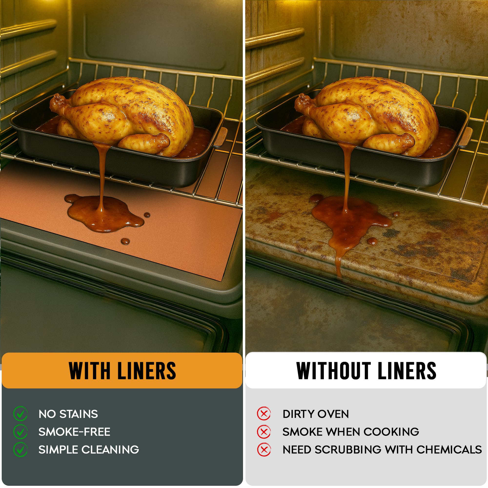 SAVE TIME & EFFORT ON CLEANUP - Avoid scrubbing stubborn baked-on spills by using these durable oven liners. They make cleanup quick and easy, so you can spend less time cleaning and more time enjoying your meals.