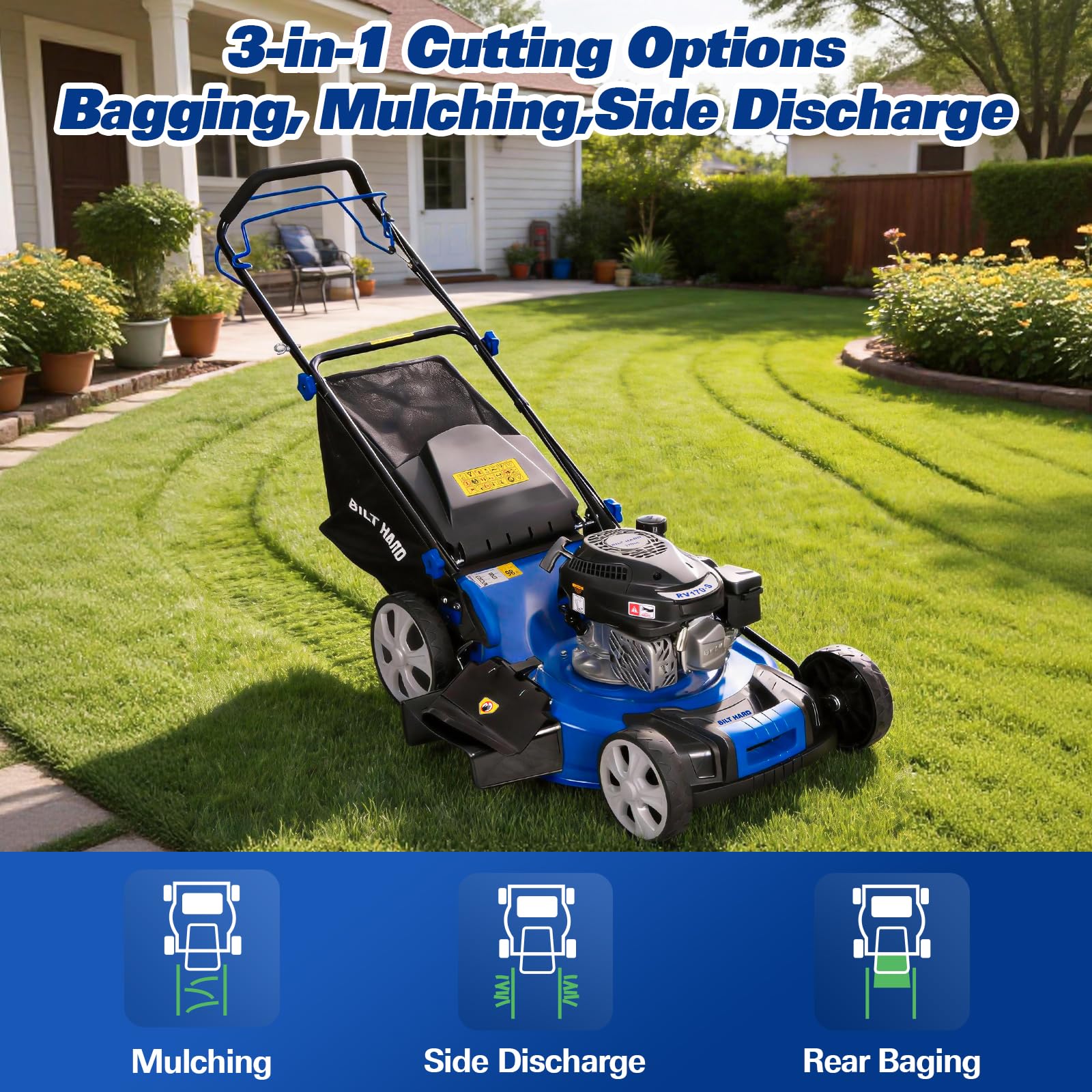 Versatile 3-in-1 Cutting System: Offering mulching and side‑discharge options, this system lets you tailor mowing to your needs: mulching finely chops clippings to enrich soil, while side discharge speeds cleanup in larger areas.