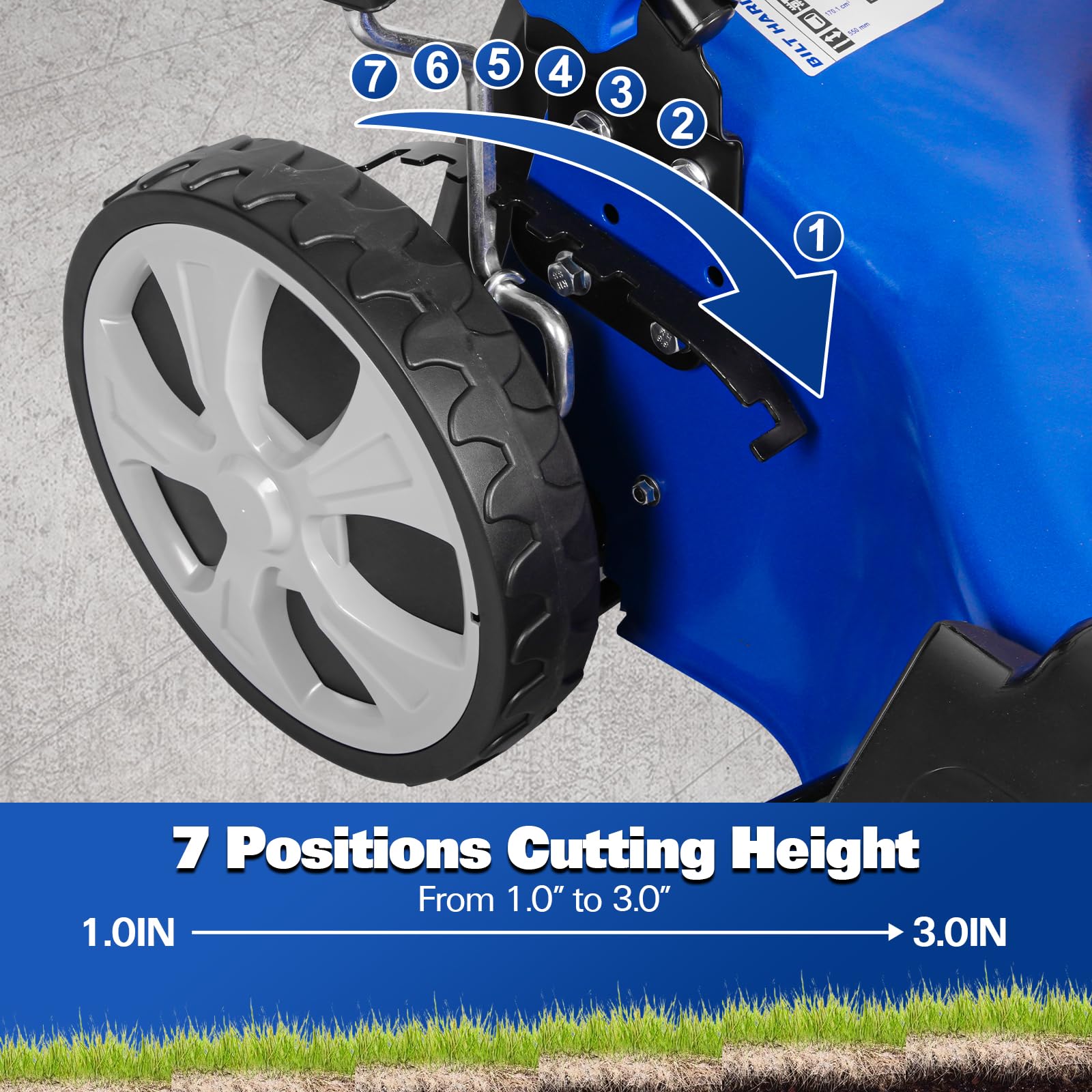 7-Position Height Control: 7‑position height adjustment lets you set the cutting height from 1.0 to 3 inches for a perfect finish—whether you like a short, tidy look or a lush green lawn.