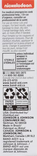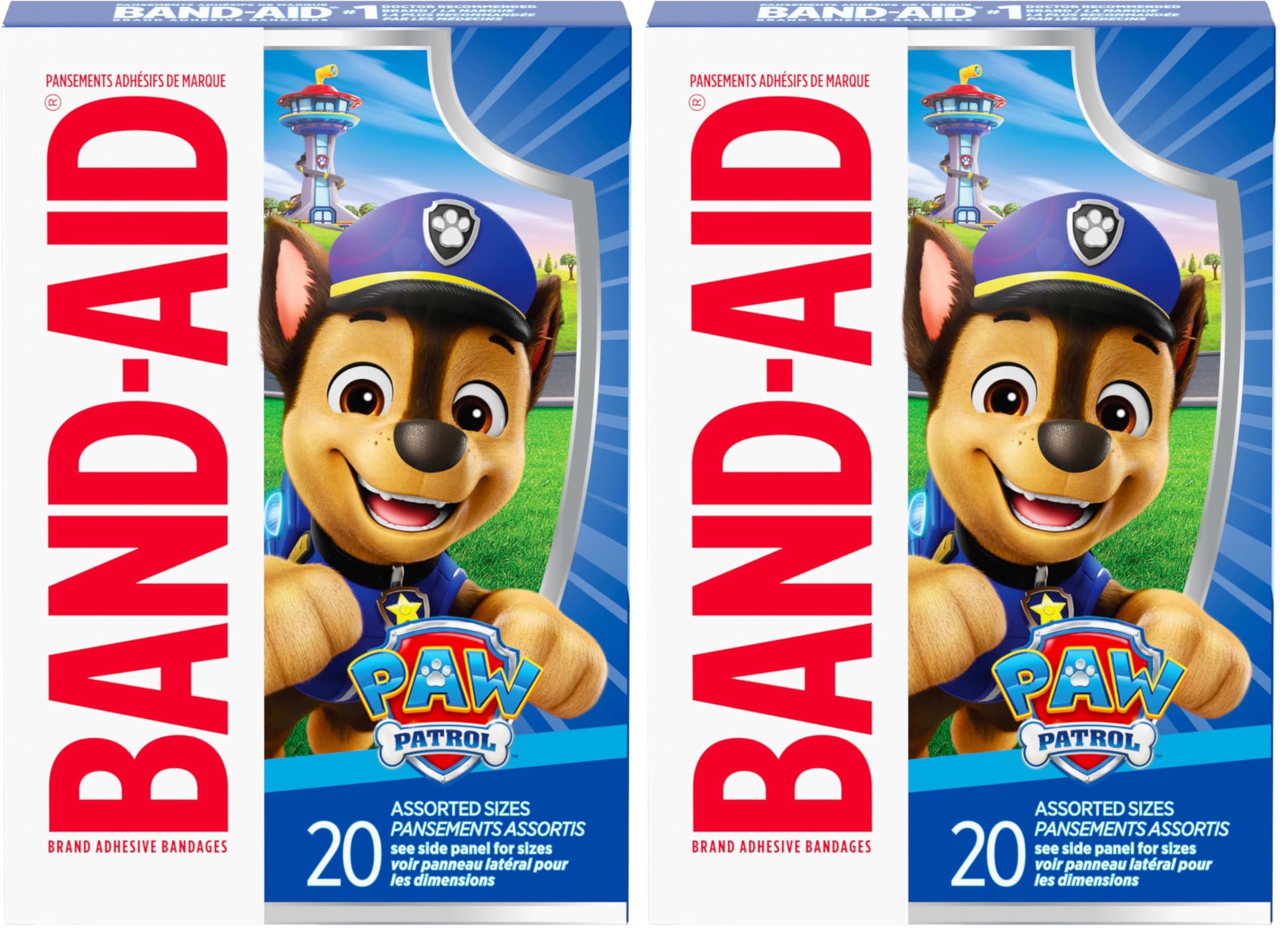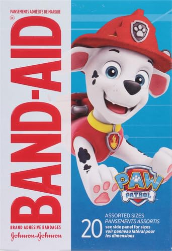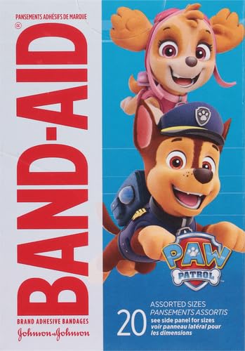 Band-Aid Brand Adhesive Bandages for kids and toddlers, featuring Nickelodeon Paw Patrol designs, cover and protect minor cuts and scrapes with fun Nickelodeon Paw Patrol graphics. These sterile bandages come in assorted sizes with designs that include Ryder and his team of pups. Band-Aid Brand Adhesive Bandages stick to the skin, not the wound. This package contains 20 sterile bandages in assorted sizes, suitable for small wounds. Band-Aid Brand Adhesive Bandages are great to keep on hand as essential first-aid supplies.