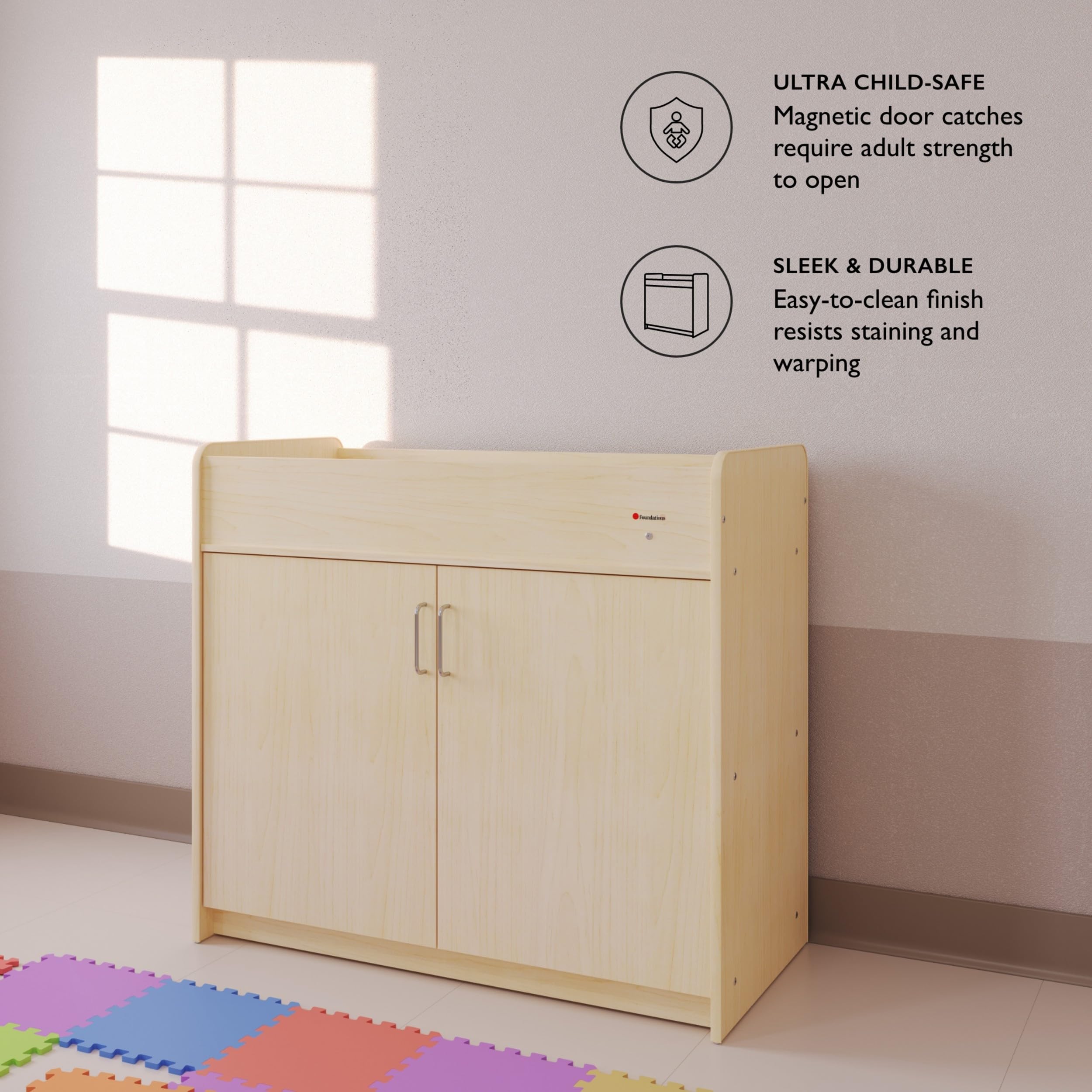 Dimensions: Measures 45”L x 21.5”W x 40.5”H, designed to fit seamlessly into nurseries or childcare centers. Strong construction ensures both long-lasting reliability and safe everyday performance.