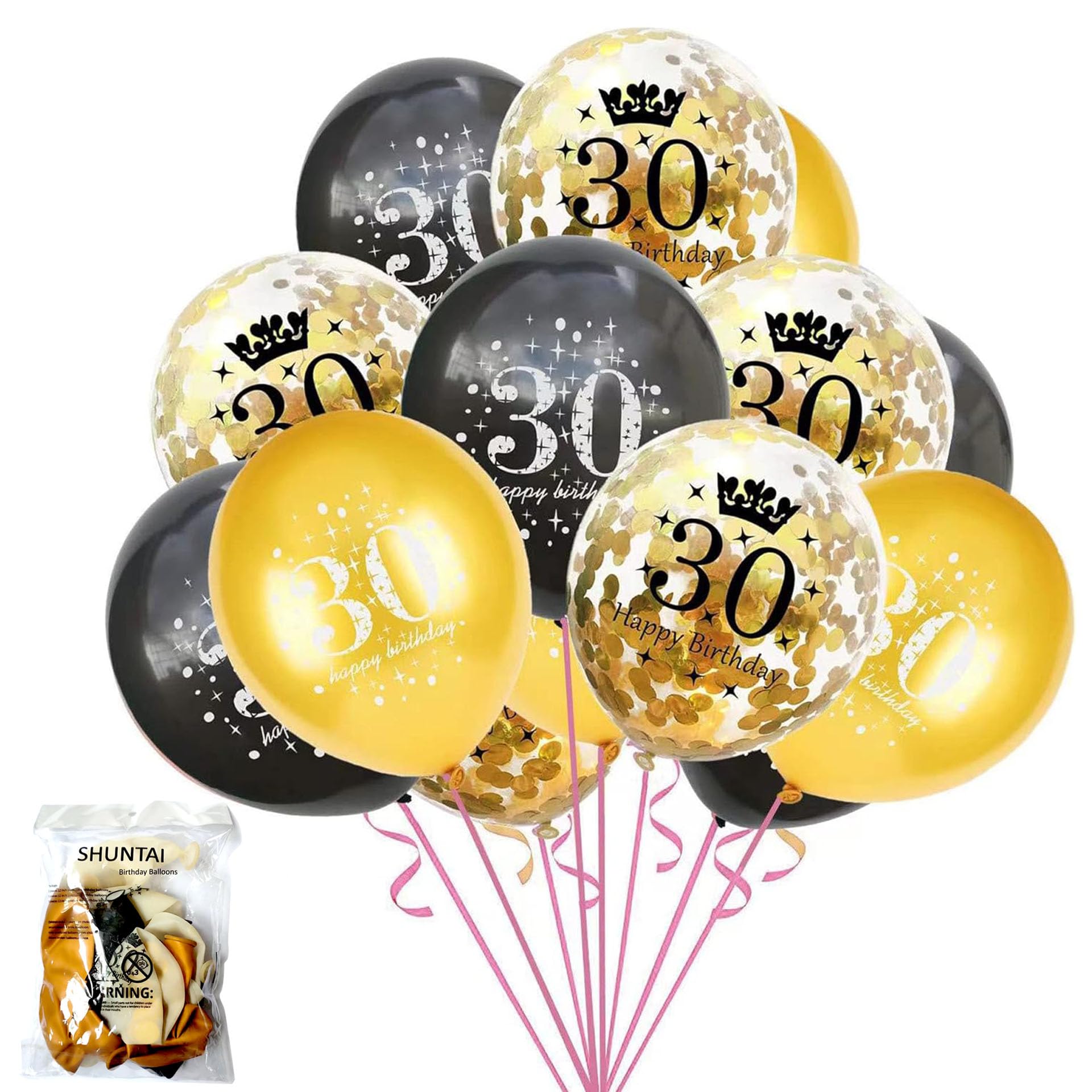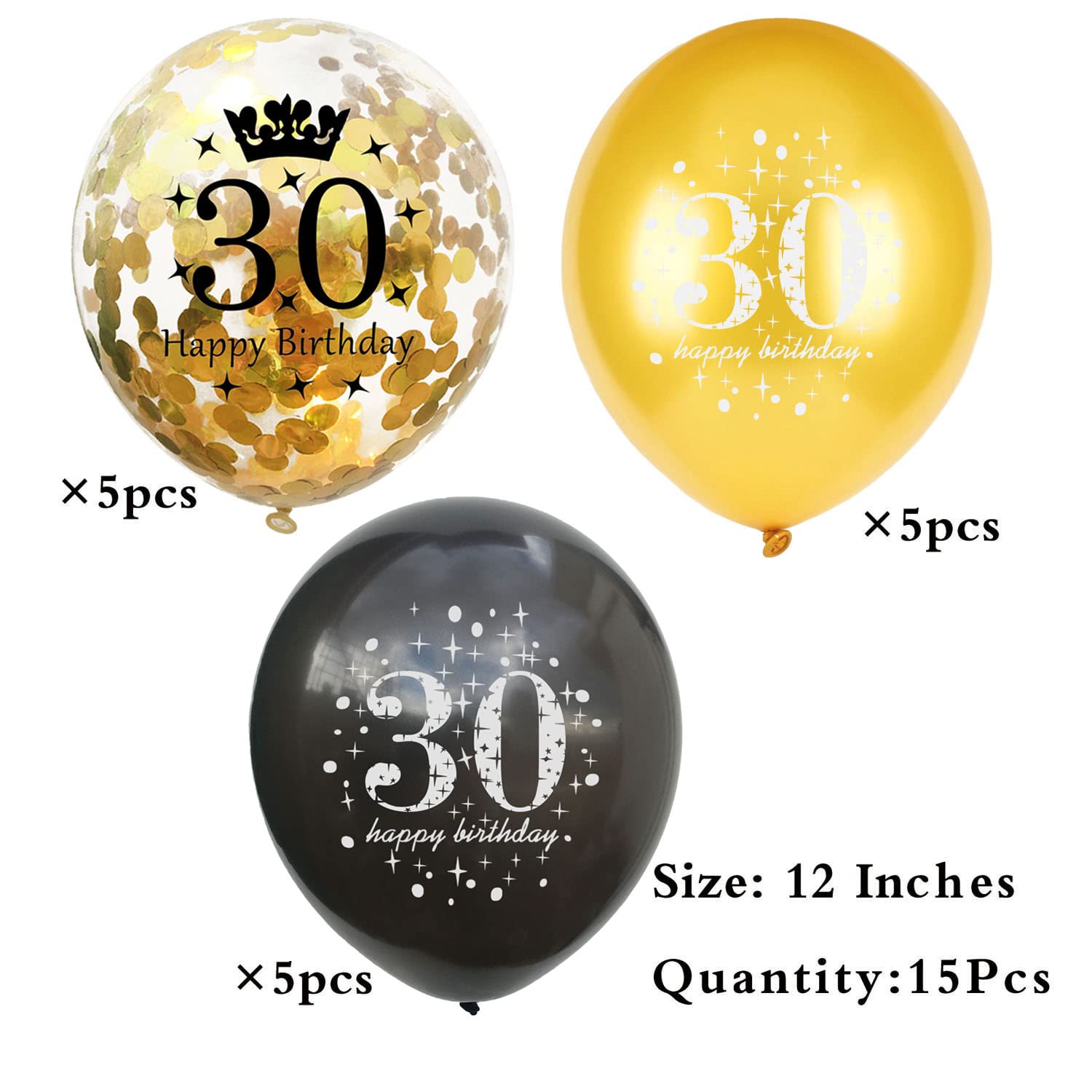 Package:5 pieces 12 inch black latex balloon printed with the words "30 Happy Birthday",5 pieces 12 inch gold latex balloon printed with the words"30 Happy Birthday",5 piece 12 inch gold confetti balloons printed with the words"30 Happy Birthday", very suitable for women men 30th birthday party decorations