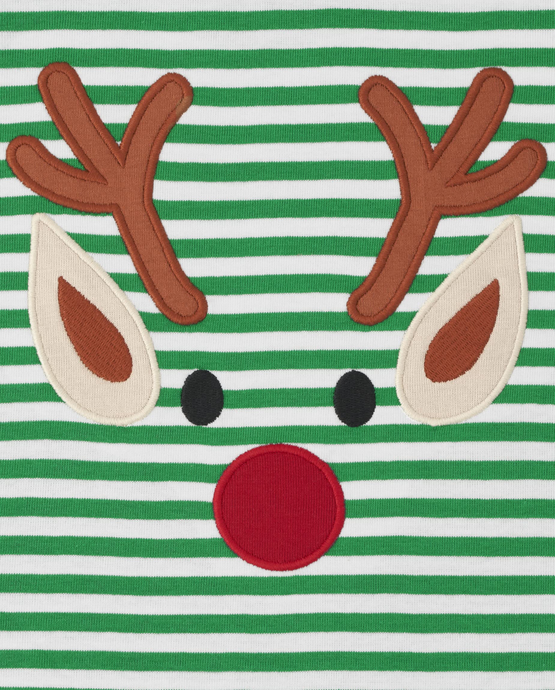 PAJAMA TOP — Features long sleeves, rib-knit crew neck and sleeve cuffs, allover stripes and reindeer face graphic design at front