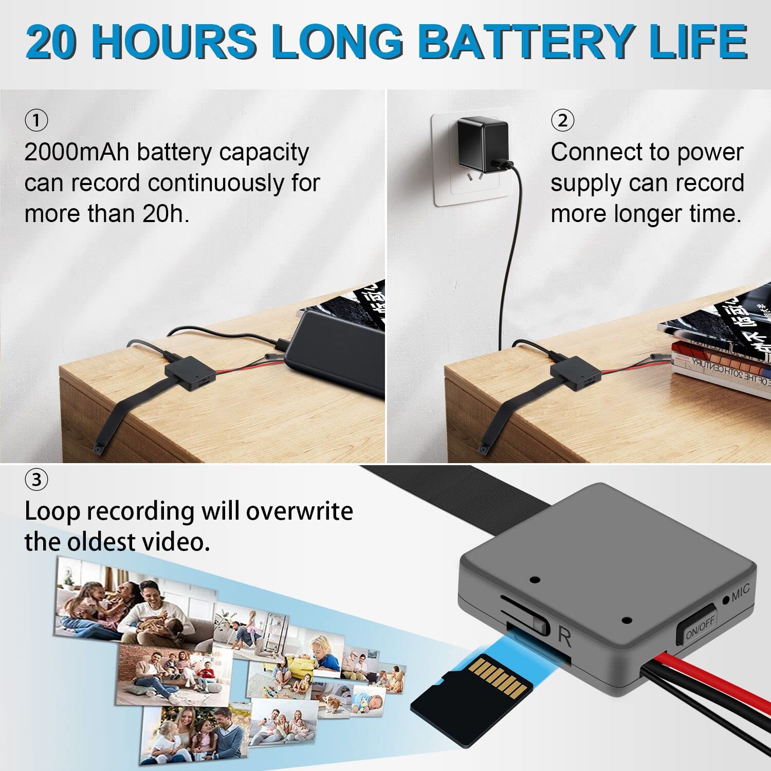 [20-hour Long Battery Life Spy Camera]: Compared to other hidden cameras, our spy camera comes with a 2200 mAh battery pack, it is enable to last about 20 hours after fully charged. It also supports recording while charging, so you never worry about running out of batteries.
