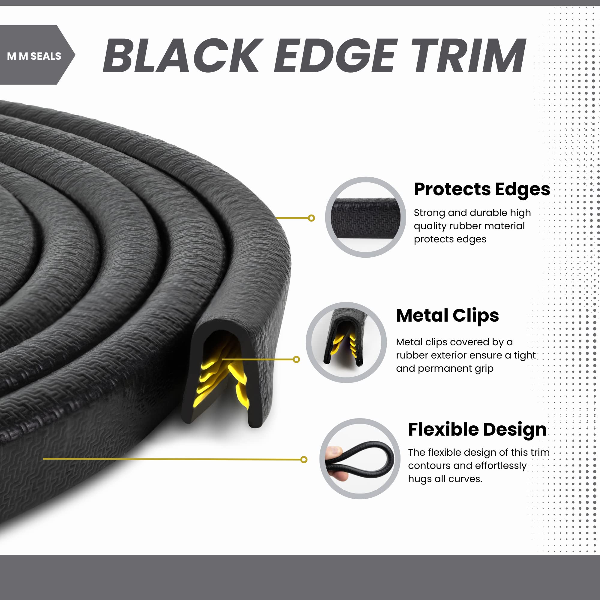 Edge Trim Black large U height 0.656" U Height x 0.039"-0.178" grip range This is trim seal that install on the metal edges. All details about the install place, dimensions and flexibility is clarified in the pictures. You can select the suitable trim seal for your vehicle by the dimensions. you can compare this trim seal dimensions and your old trim seal dimensions.