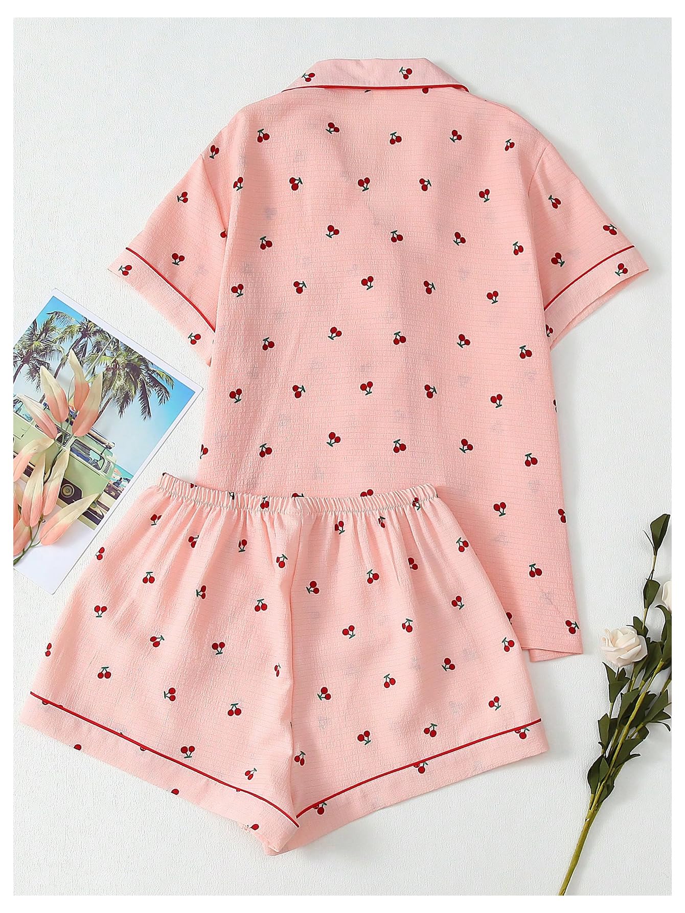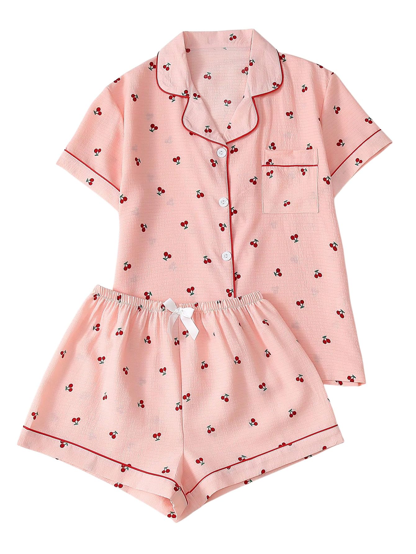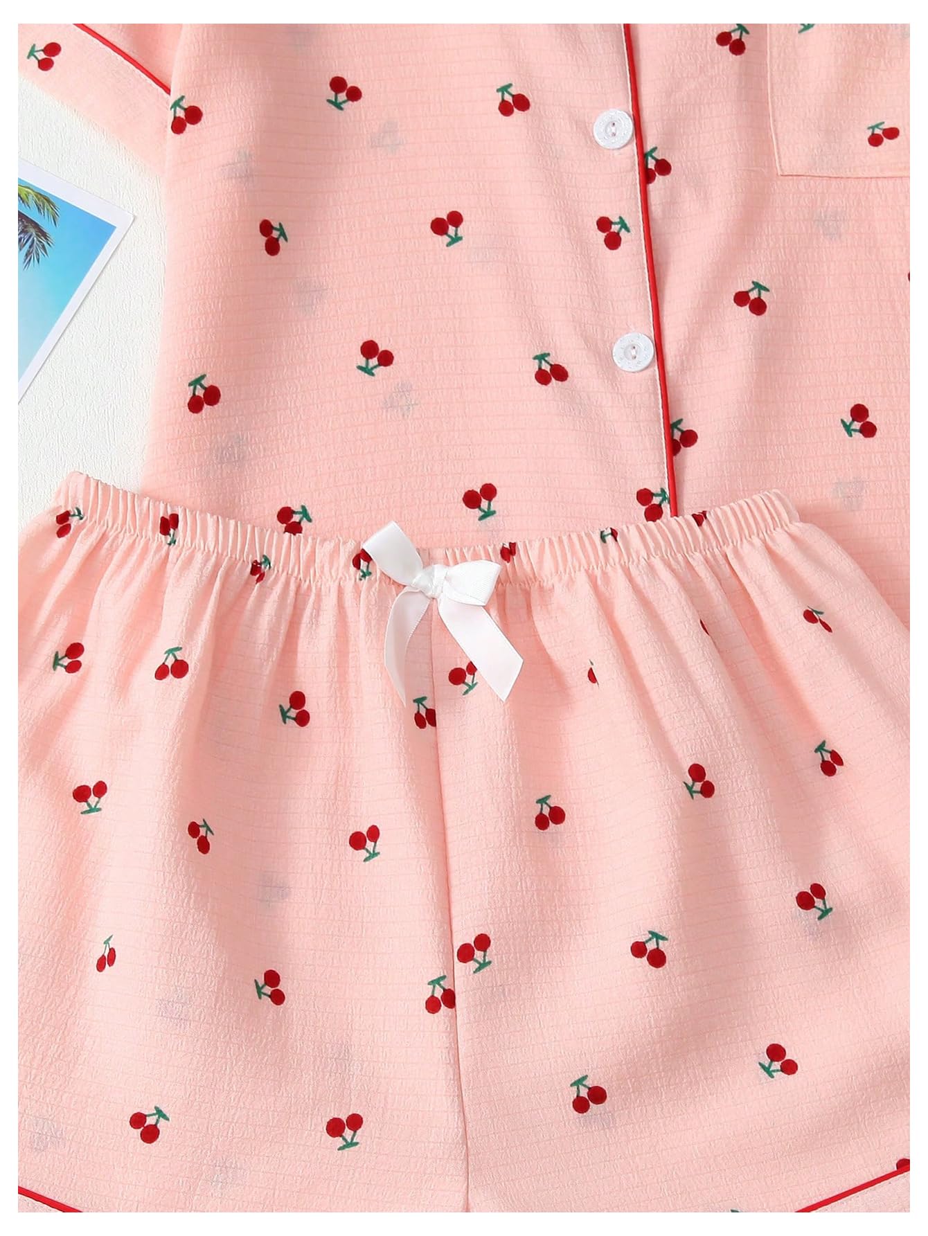 Lapel Collar, Short Sleeve, Print Pajamas, Bow Decoration, Button Down Top and Shorts, Loungewear Sets, Women's Sleepwear.