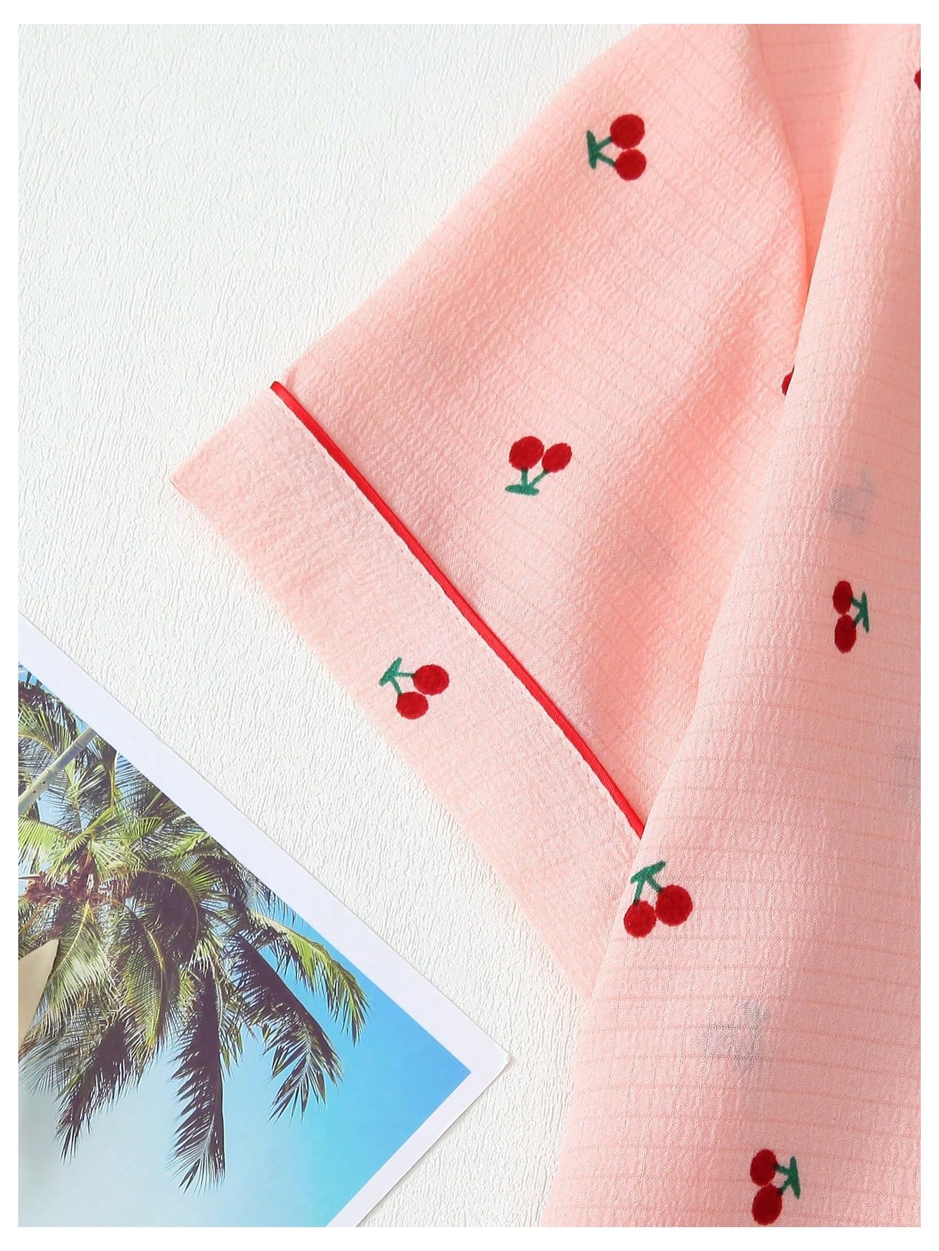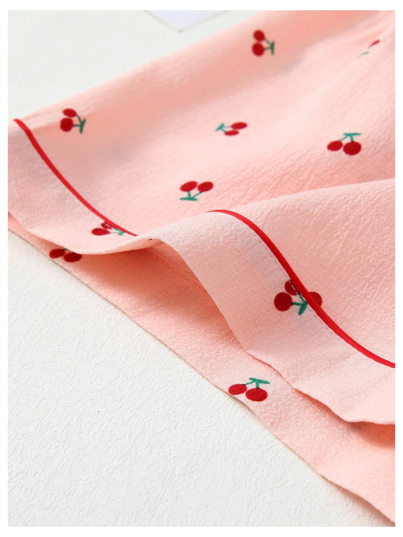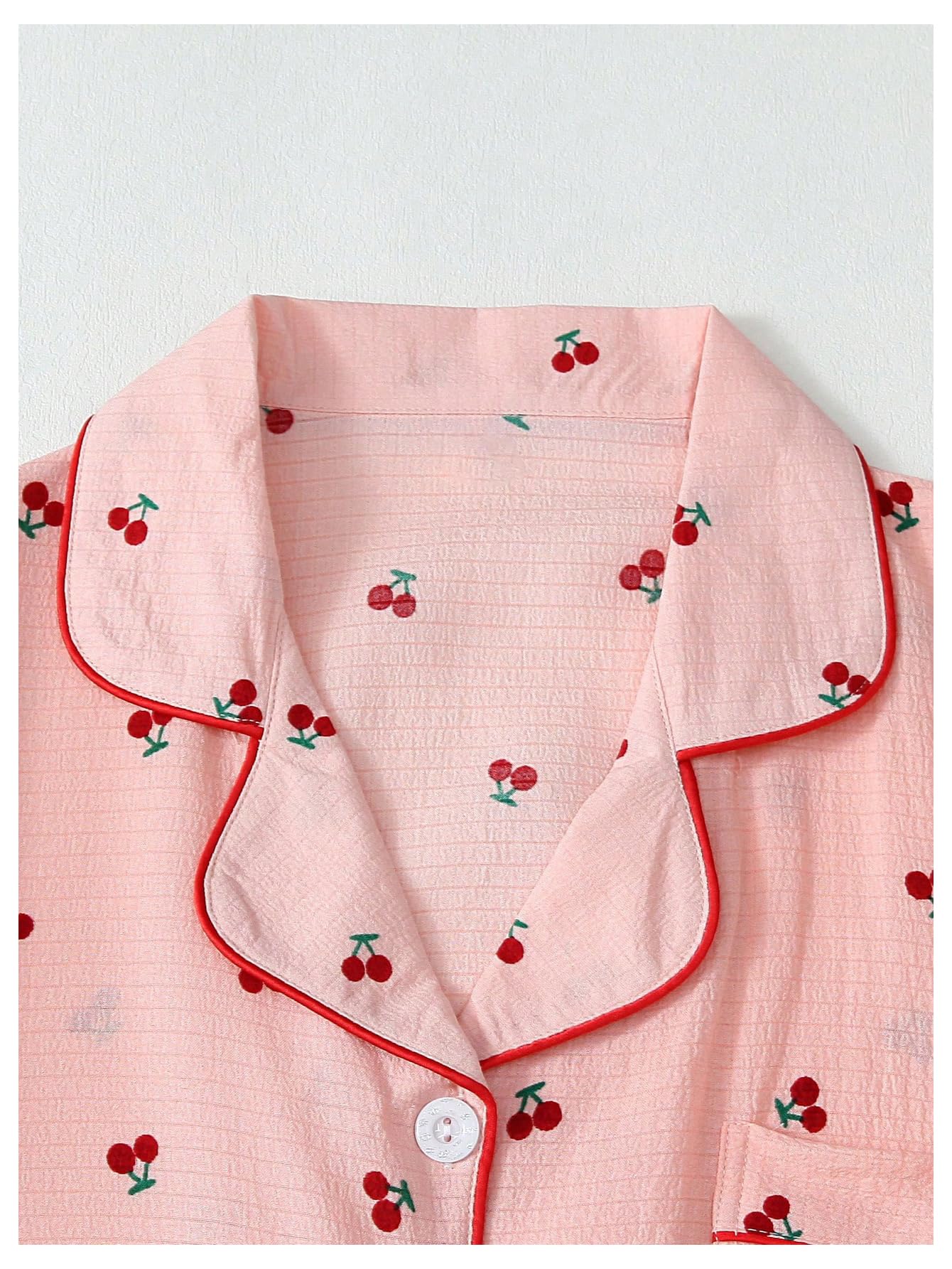 Lapel Collar, Short Sleeve, Print Pajamas, Bow Decoration, Button Down Top and Shorts, Loungewear Sets, Women's Sleepwear.