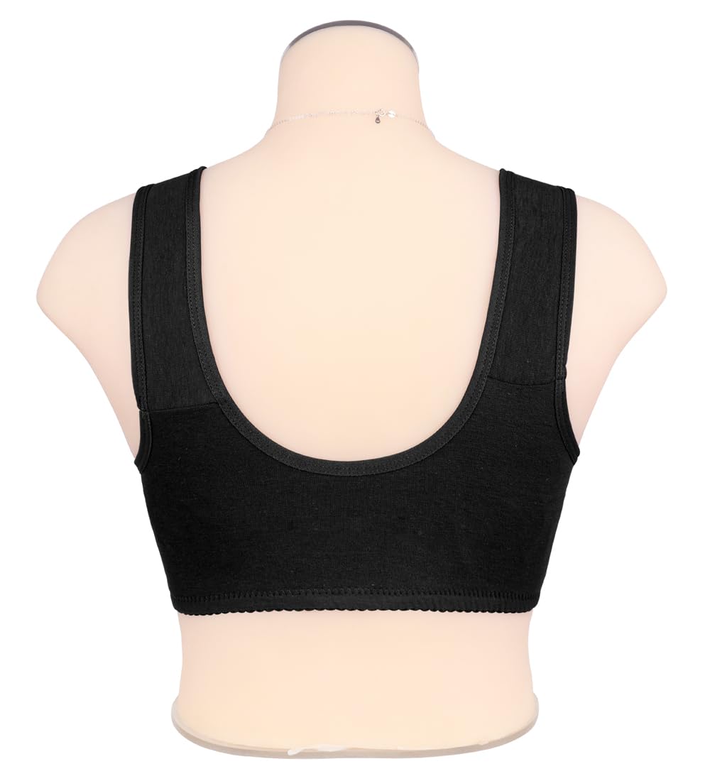 No underwire, Higher sides, Fuller cups, Wider straps, With daisy embellishments.