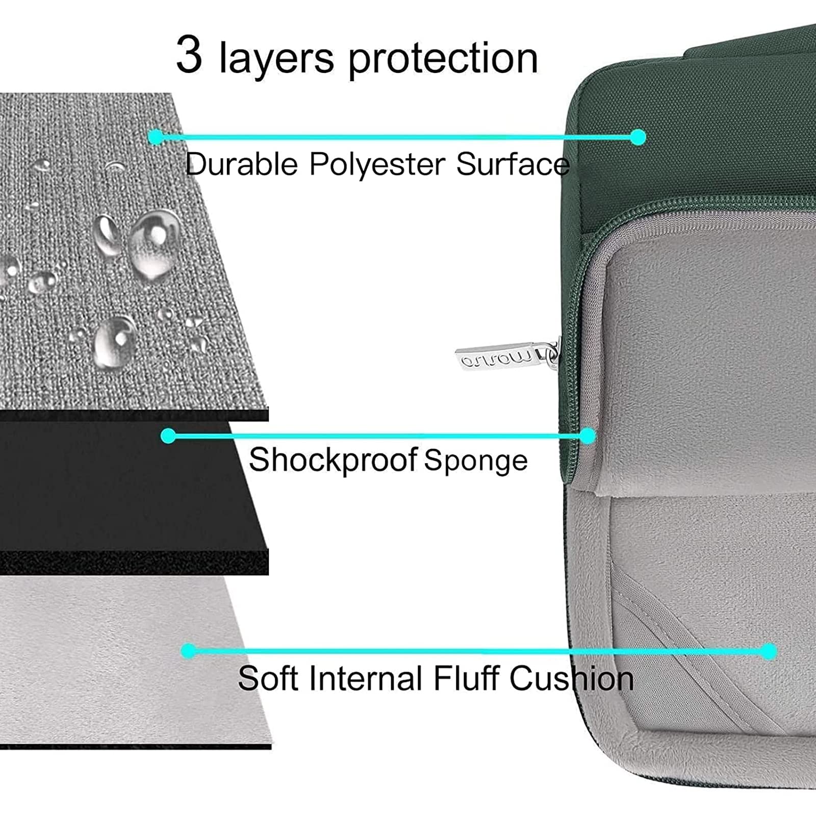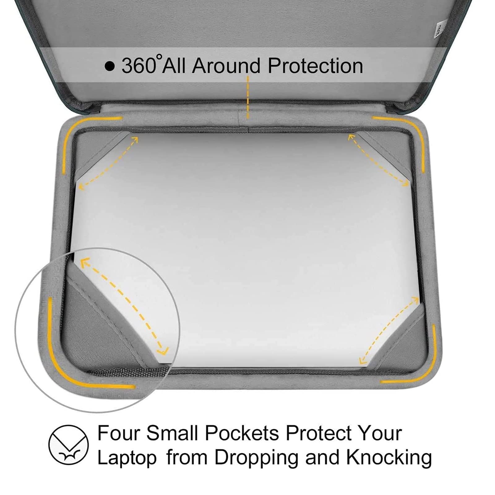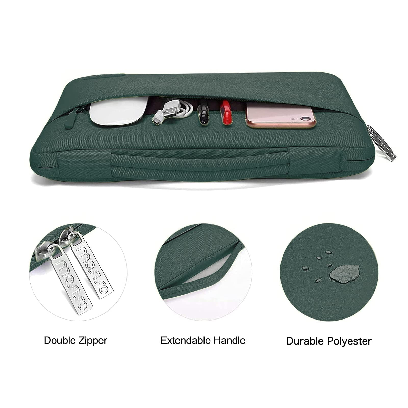 The 360 degree protective shockproof laptop sleeve with handle carrying bag internal dimension: 13.39 x 9.25 x 0.79 inches (L x W x H); external dimension: 13.98 x 9.84 x 0.79 inches (L x W x H). The front side pocket dimension: 11.61 x 9.25 inches (L x W). Made of polyester material, protect your laptop against accidental spills. Slim and lightweight, does not bulk your device up and can easily slide into your briefcase, backpack or other bag. Ideal for business, daily and travel.