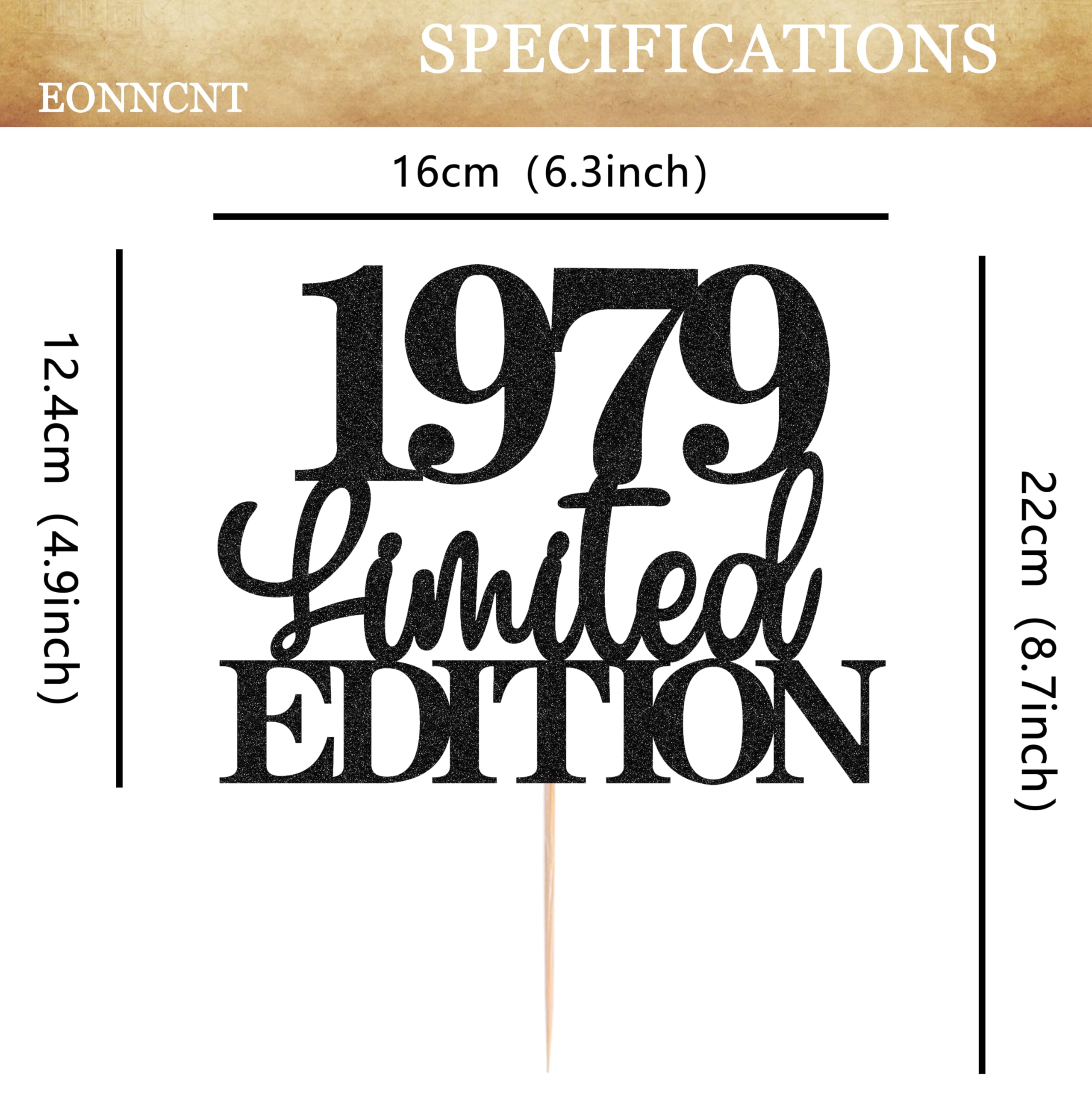 🌹Have you been looking for a decoration that can make your birthday cake instantly dazzling? Do you yearn to find the finishing touch that perfectly embodies the glorious 47 years of history?🌹 [Brand Introduction] 💞EONNENT is a team dedicated to the research and development of party products. Our team hopes that our product can bring you happiness. Let you receive everyone's blessings at your important milestone moment, leaving no regrets💞 [Product Include] 🎈1PCS Limited EDITION 1979 Cake Topper [Core Features and Functions of The Product] ✨Shining Light Function ✨Theme highlighting function [Product Material and Quality] We have chosen high-quality friendly materials to create the Limited EDITION 1979 Cake Topper. This material is lightweight yet very sturdy, not easily deformed or damaged, and can be stably placed on top of cakes. After meticulous processing, the surface is smooth and delicate, ensuring that glitter elements can firmly adhere and will not easily fall off. Under strict quality control, every cake topper meets high standards, so you don't have to worry about any quality issues during the party. It will consistently add luster to your birthday cake and accompany you throughout the unforgettable 47th birthday celebration [Product Design and Appearance] In terms of design, the Limited EDITION 1979 Cake Topper cleverly blends classic and fashionable elements. It is presented in a simple and atmospheric style, with the black "1979" number complementing the sparkling effect, showcasing the solemnity and preciousness of the 47th birthday while retaining the vitality and charm of modern fashion. Its exquisite design and just the right size make it perfect for pairing with multi-layer luxury cakes or simple single-layer cakes, becoming the most attractive decoration on cakes. Its color matching has been carefully blended to harmoniously blend with various birthday party themes, it can naturally blend in and enhance the aesthetic taste of the entire party scene [Product Tips] ‼️ The product is not edible, do not put it in your mouth ‼️ The product is made of cardboard and cannot be cleaned 💞Let's enjoy this beautiful day together without any regrets💞