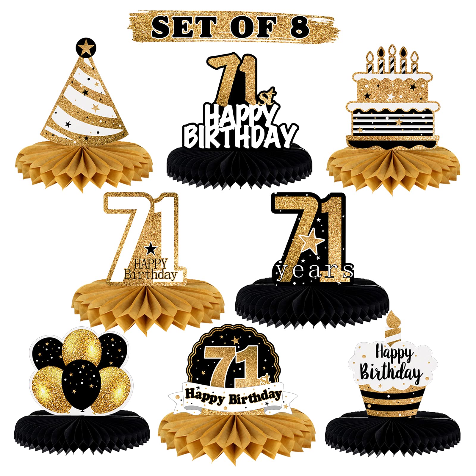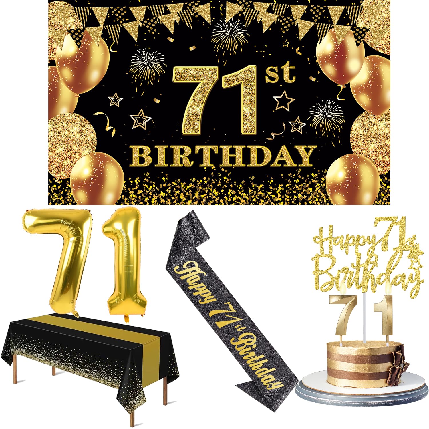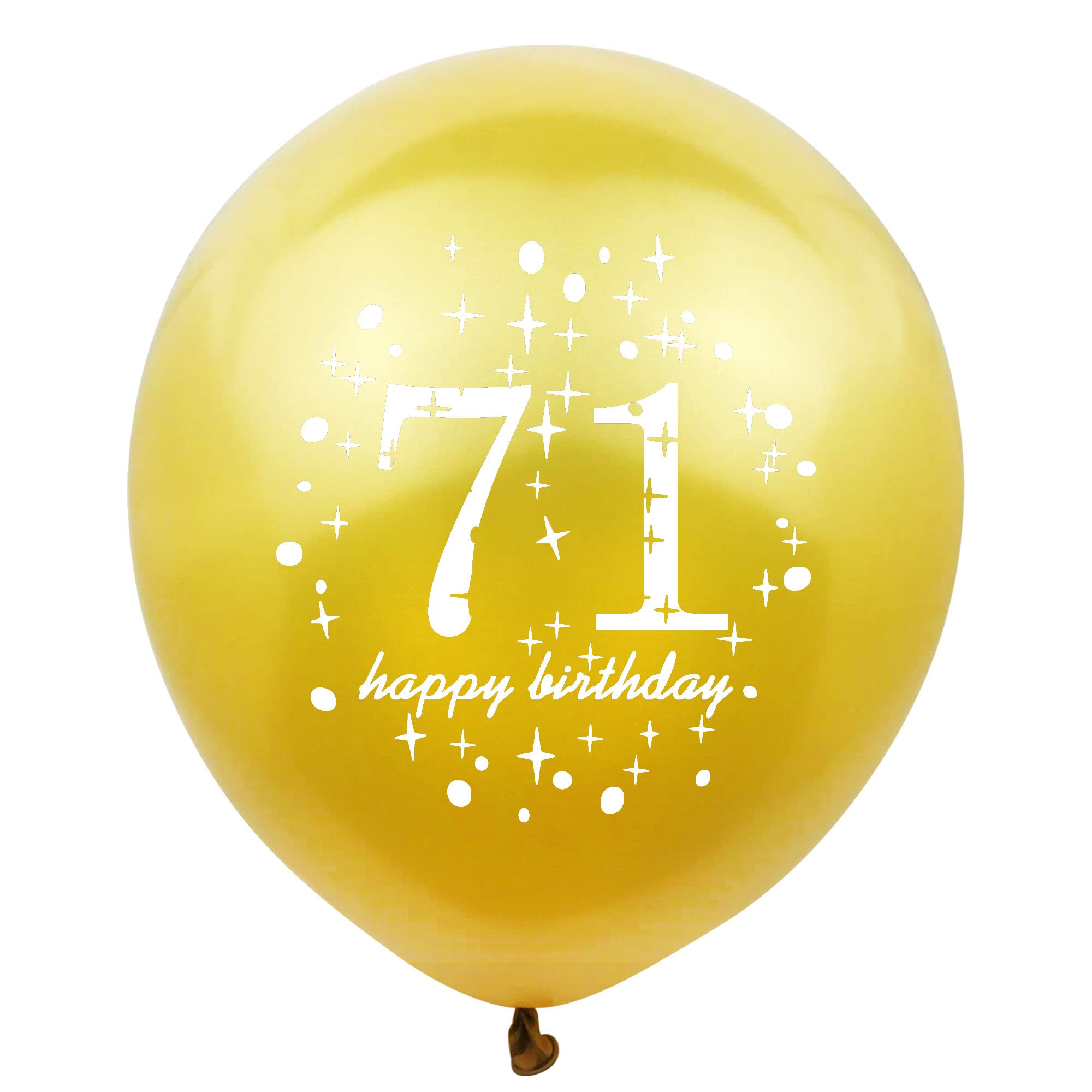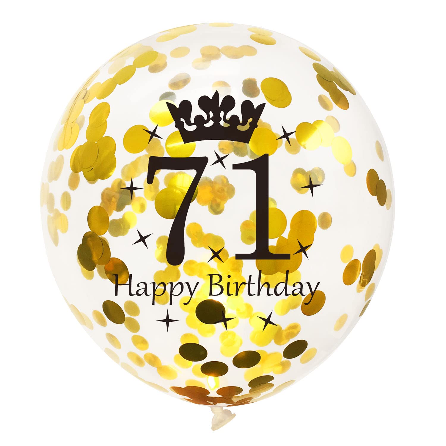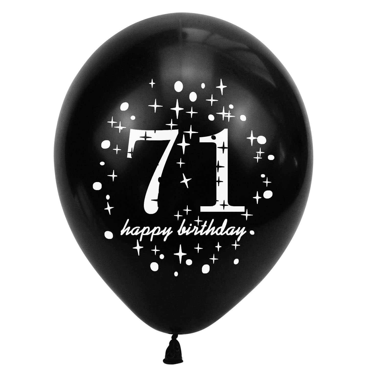 Package:5 pieces 12 inch black latex balloon printed with the words "71 Happy Birthday",5 pieces 12 inch gold latex balloon printed with the words"71 Happy Birthday",5 piece 12 inch gold confetti balloons printed with the words"71 Happy Birthday", very suitable for women men 71st birthday party decorations