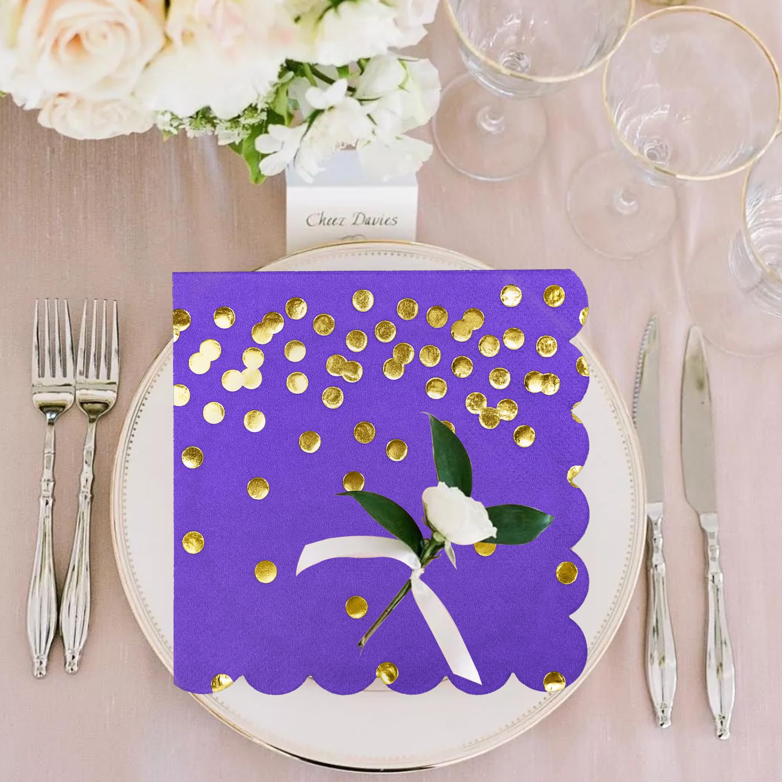 Scalloped and Gold Foil Polka Dot Design: This Cocktail Napkins designed in scalloped edge with Gold Foil Polka Dot Confetti,these napkins are sure to compliment your gold dinnerware.