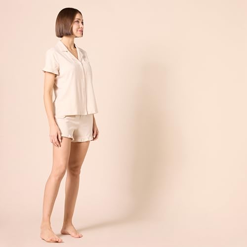DETAILS: The top features a notch collar, single patch pocket, and ruffle detail at sleeve opening. The shorts feature an elasticated waistband and feminine ruffle detail at leg opening.