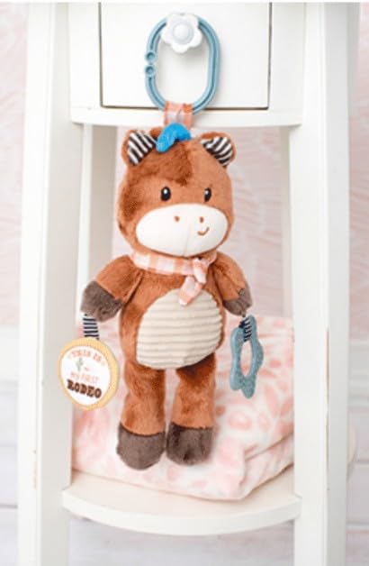 Baby will be all smiles with this travel Plush Horse activity toy. The cute, soft horse has crinkle, rattle and teething features. Your little buckaroo will be entertained and soothed with this toy. The travel hook is perfect for a stroller, car seat, high chair and more. This activity toy is great fun at home or on the go.