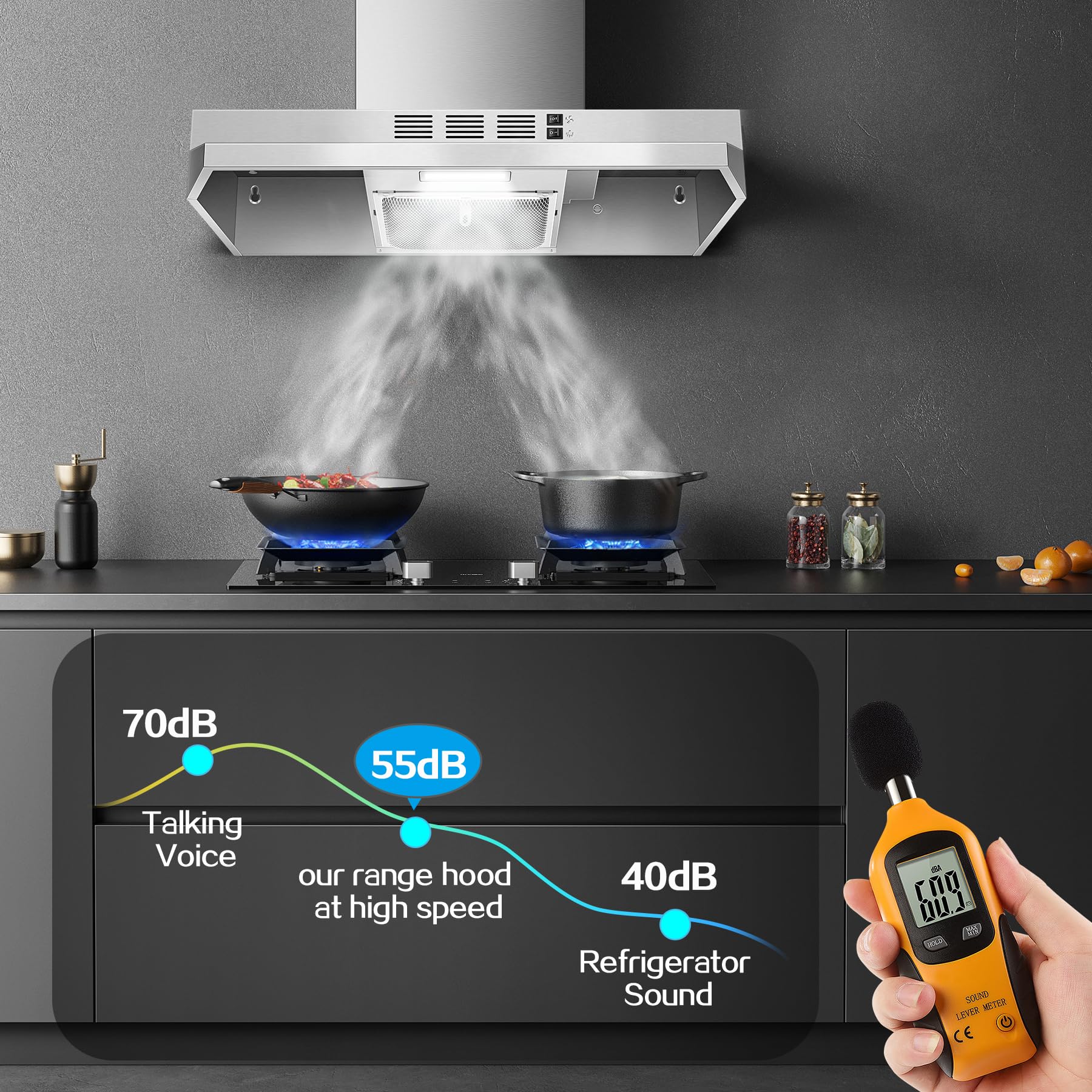 Bright and Effective Lighting: The vent hood 24 inch has one piece 2W LED light, not only brightness to meet your cooking need, but also the range hood save energy in your kitchen while emitting enough lights.