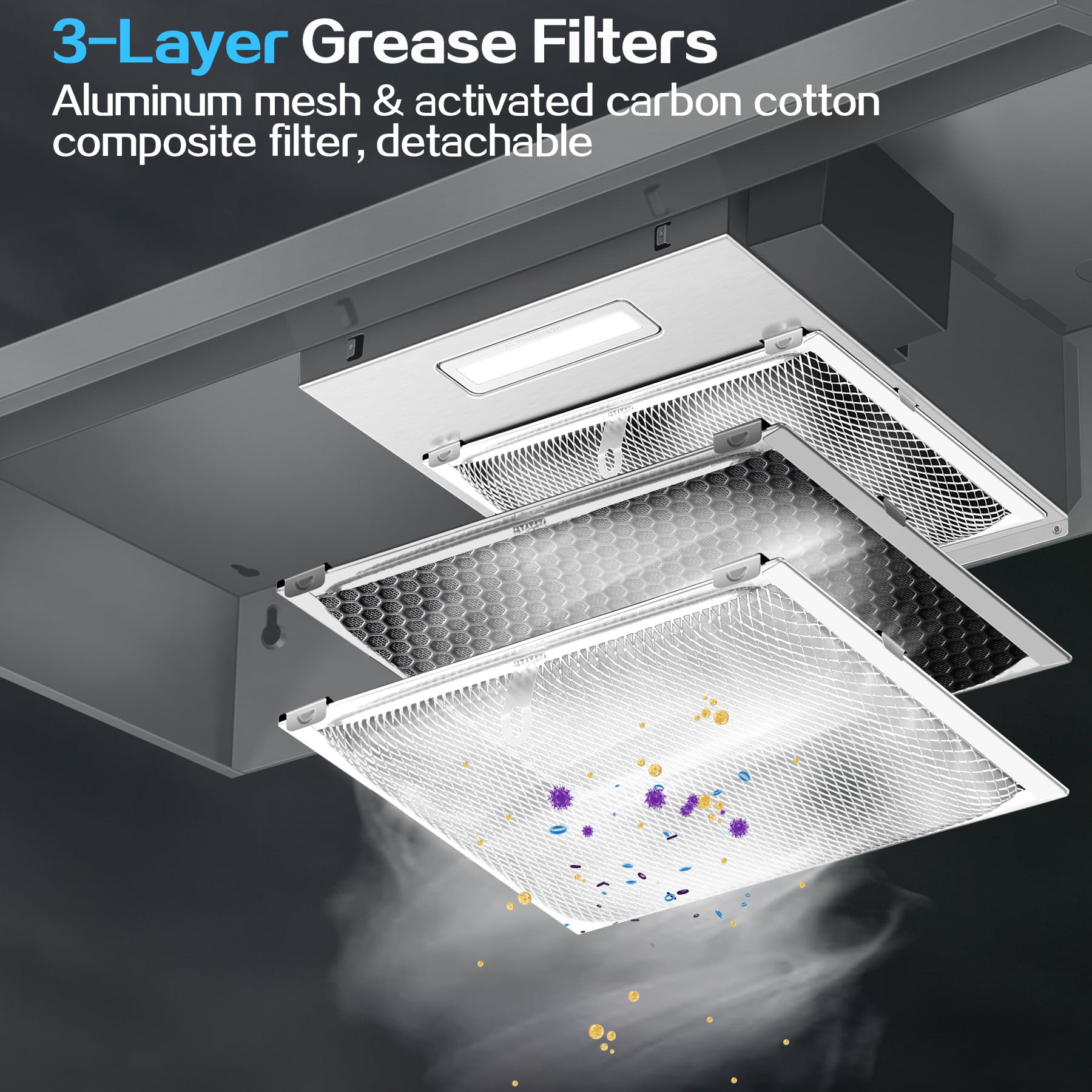 3-layer Grease Filter: Including one piece aluminum mesh & activated carbon cotton composite filter, this range hood 24 inch will purify the air, removing grease from the smoke. (Suggest replacing every 3~4 months, Part#ZMS-3976-F)