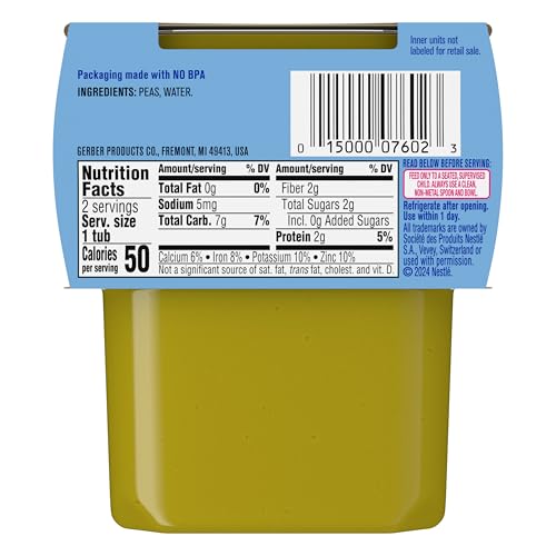Gerber Stage 2 Baby Food, Baby Peas Puree Tubs are a premium choice for your child’s early stages. Crafted to help support their nutritional needs, along with meeting the busy lifestyle needs of caretakers and parents. Each baby puree tub contains 163 peas and comes in a portable, easy-to-store format – making it perfect for life’s busy moments. This stage 2 baby food puree is designed for babies who are 6 months + and are ready to explore new textures and flavors. The baby peas are finely pureed to ensure a smooth and enjoyable eating experience for your little one. Gerber understands the importance of providing wholesome ingredients during the crucial developmental stages of your child's life -- that’s why our baby peas are Non-GMO Project Verified. These baby peas have no added salt, and have no artificial flavors or colors. They need to be refrigerated after opening and must be used after 1 day. Gerber baby puree is ideal for parents who seek a convenient and high-quality option in their baby's diet. This pack comes with 2 tubs.