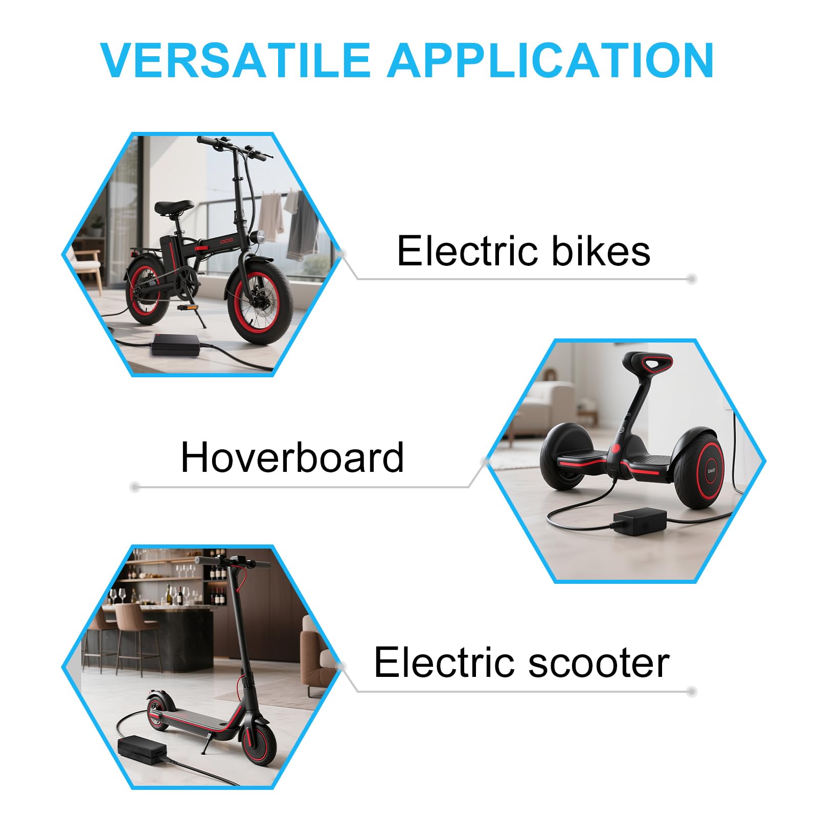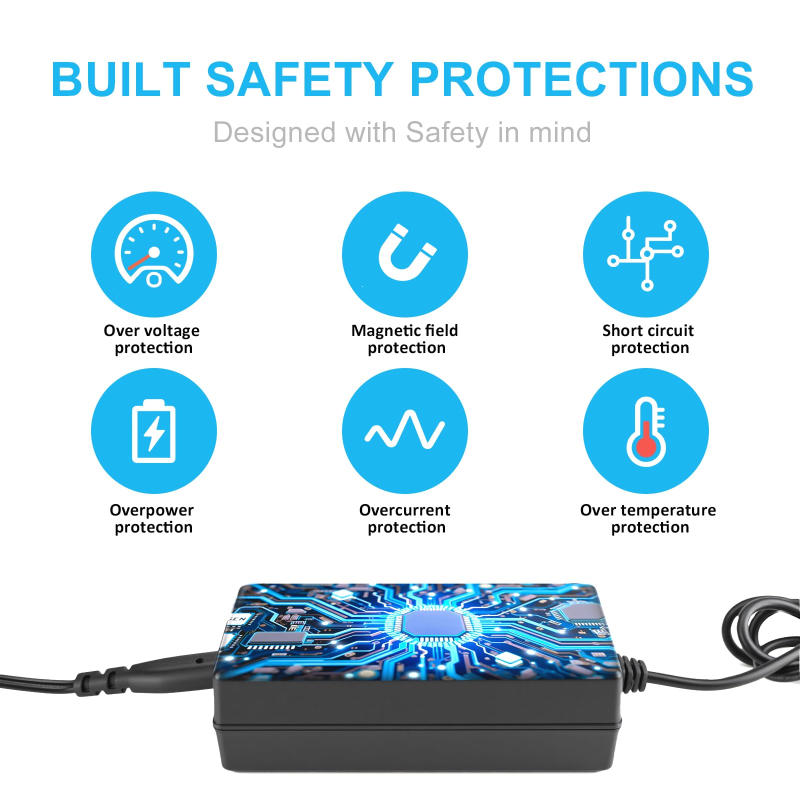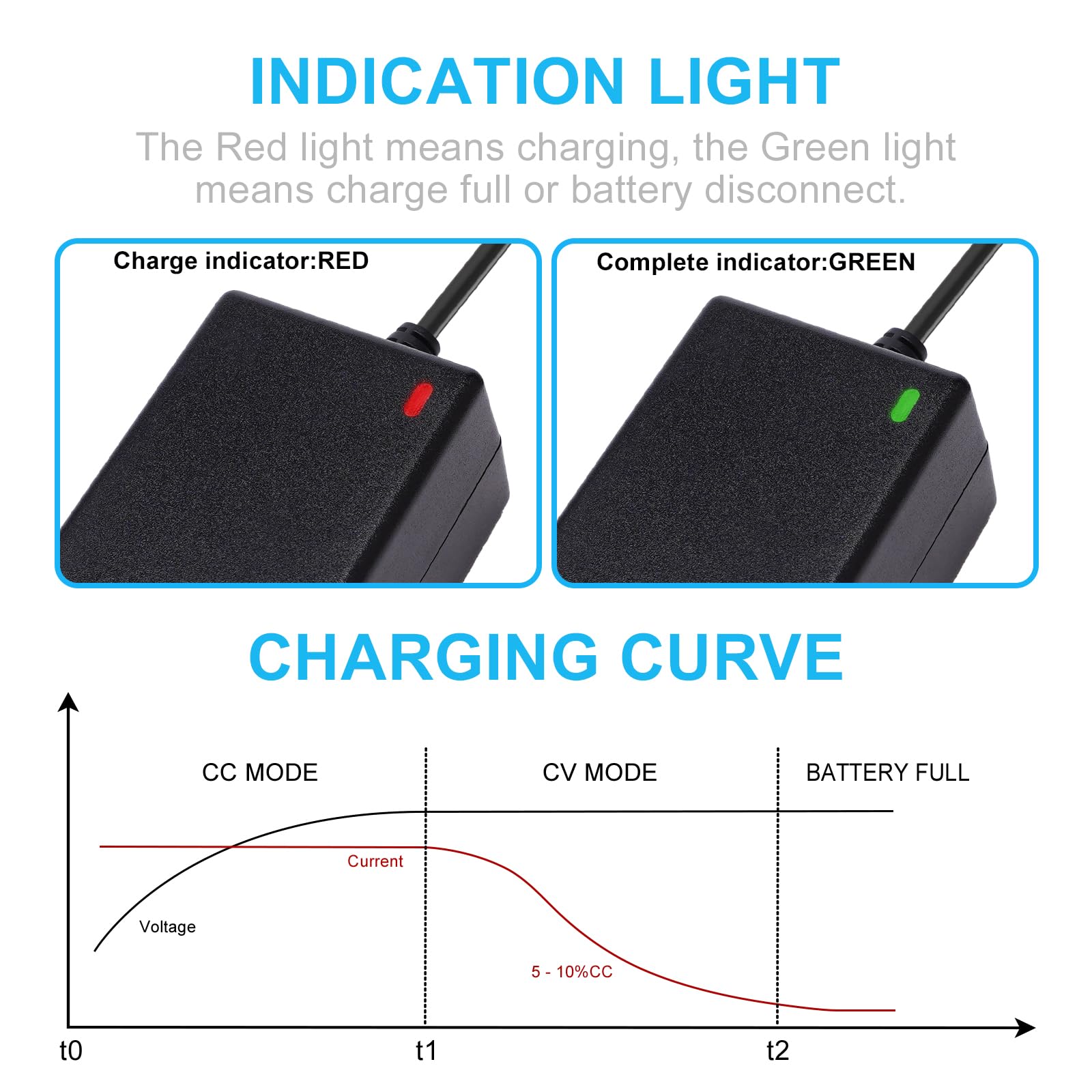 Intuitive LED Indicators – Track Charging in Seconds: No more guessing if your battery is charged. Our charger features dual LED lights that tell you exactly what’s happening: Red light: Charging in progress (CC mode: constant current for fast, stable power delivery). Green light: Fully charged or disconnected (CV mode: constant voltage to protect battery life and prevent overcharging). Simple, intuitive, and no app needed—perfect for busy riders, commuters, and families.