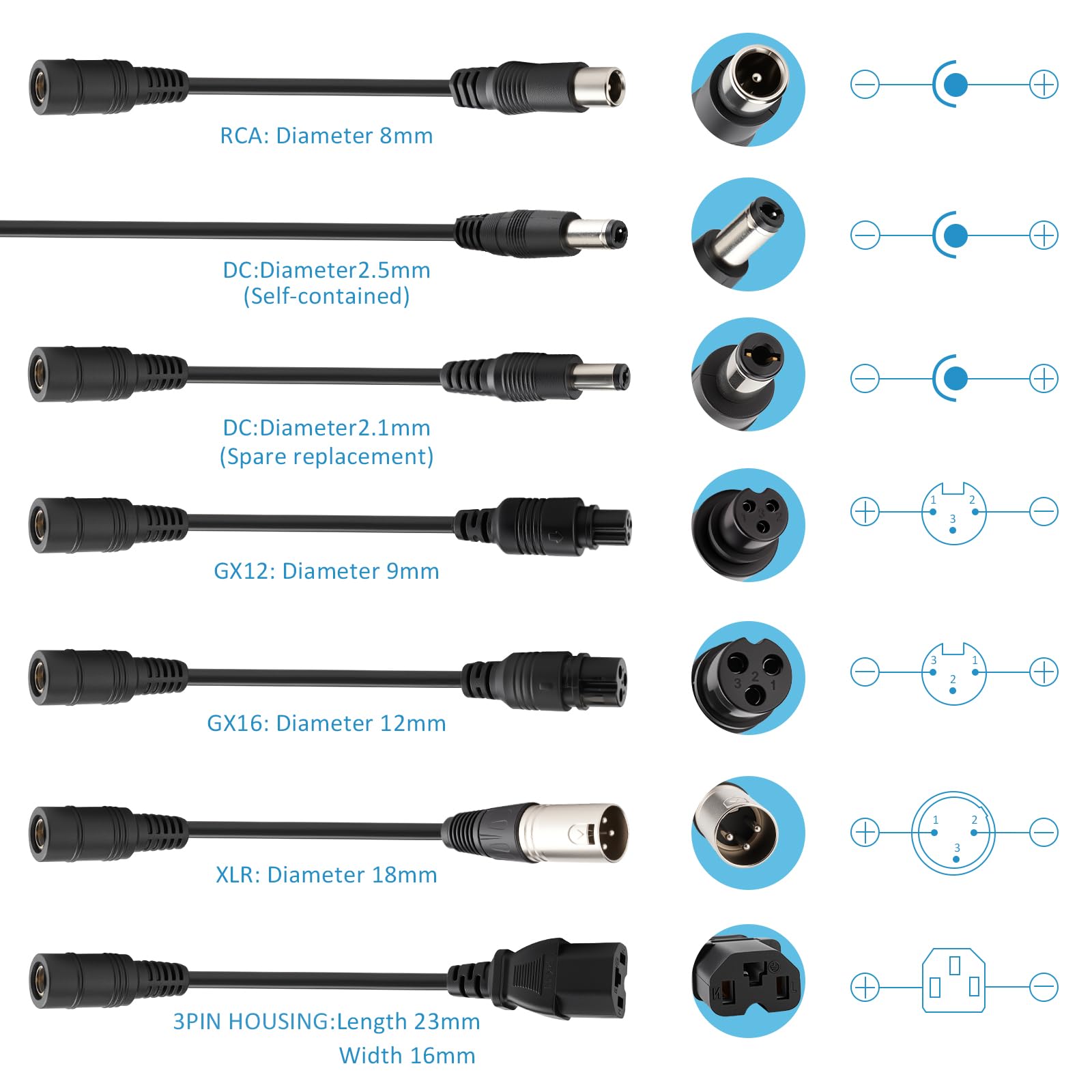 7 Practical Interfaces – Solve Your Connection Headaches: DC 5.5×2.1mm (built-in), DC 5.5×2.5mm (spare), GX12 (9mm), GX16 (12mm), RCA (8mm), XLR (18mm), and 3PIN HOUSING (23×16mm). Each adapter’s size is clearly labeled (e.g., GX12: 9mm, DC 5.5×2.5mm: self-contained), so you can quickly grab the right plug for your device. No more mismatched cables—this set works with most 24V 7S lithium battery packs.