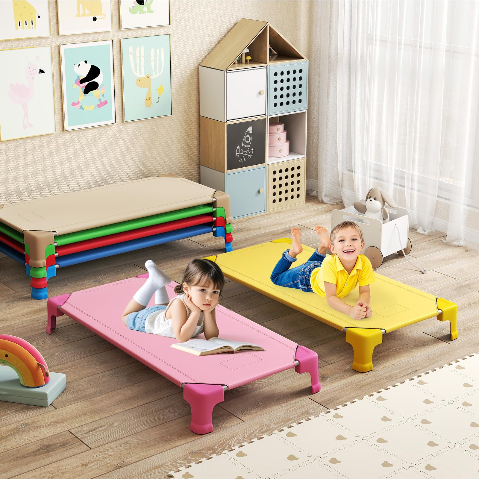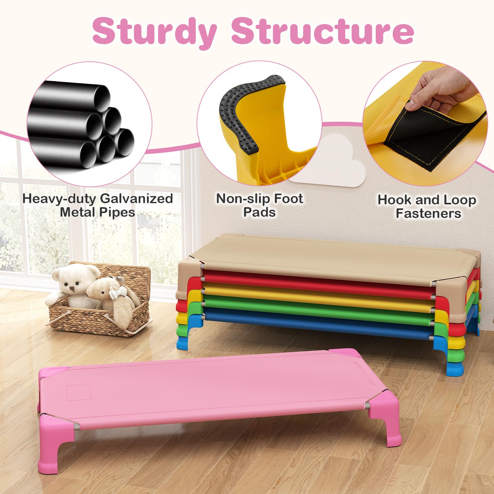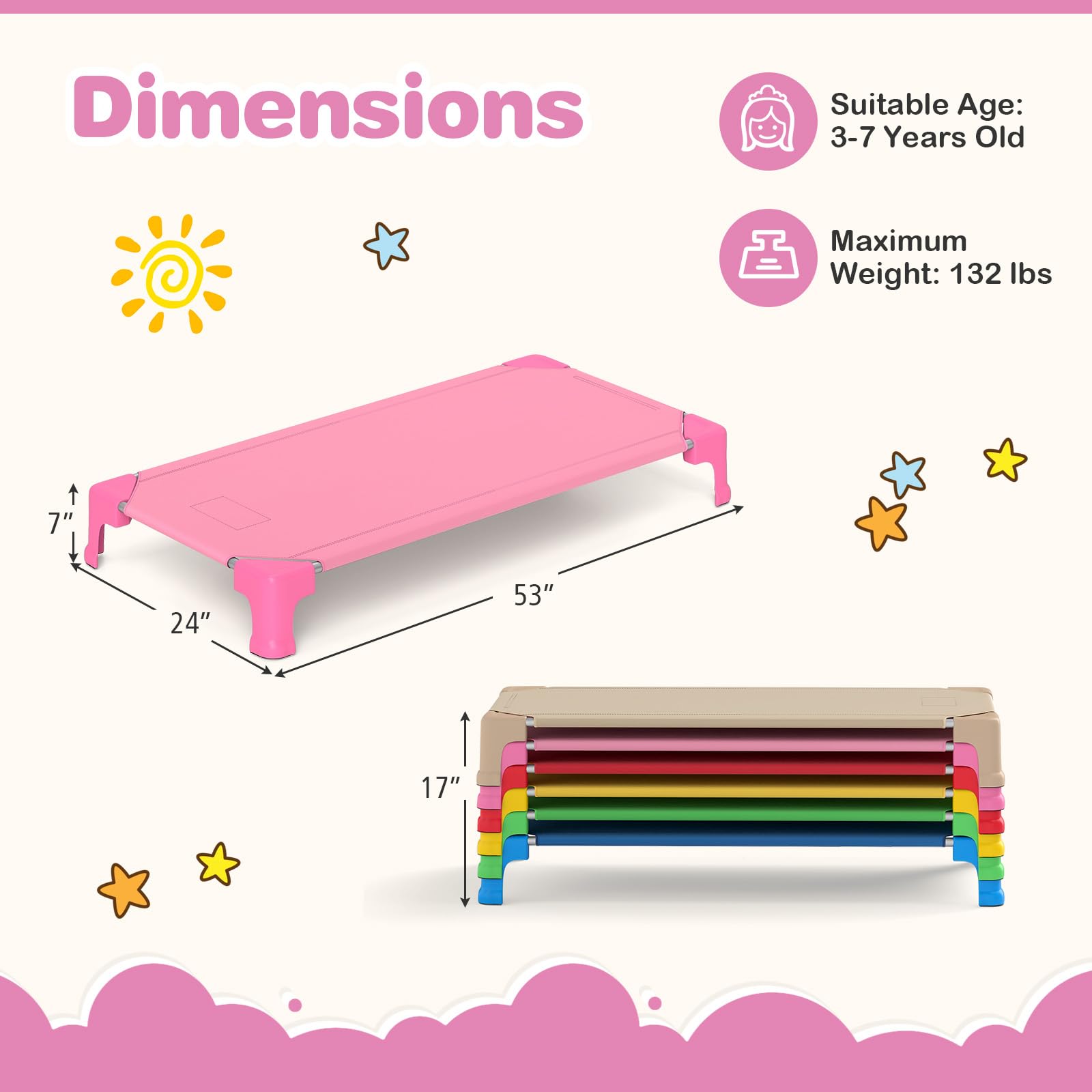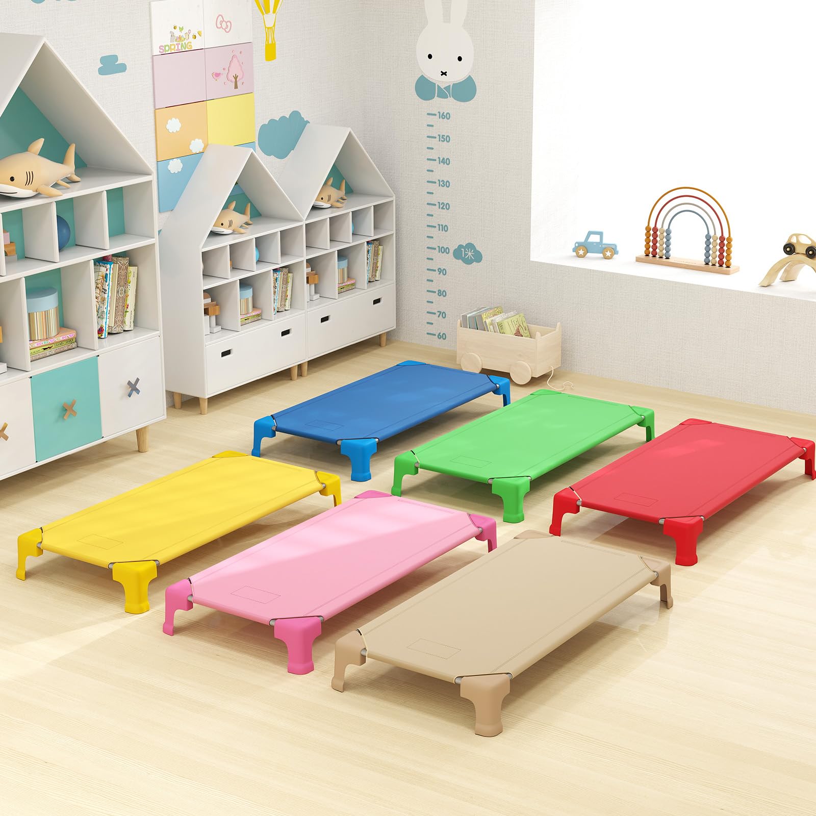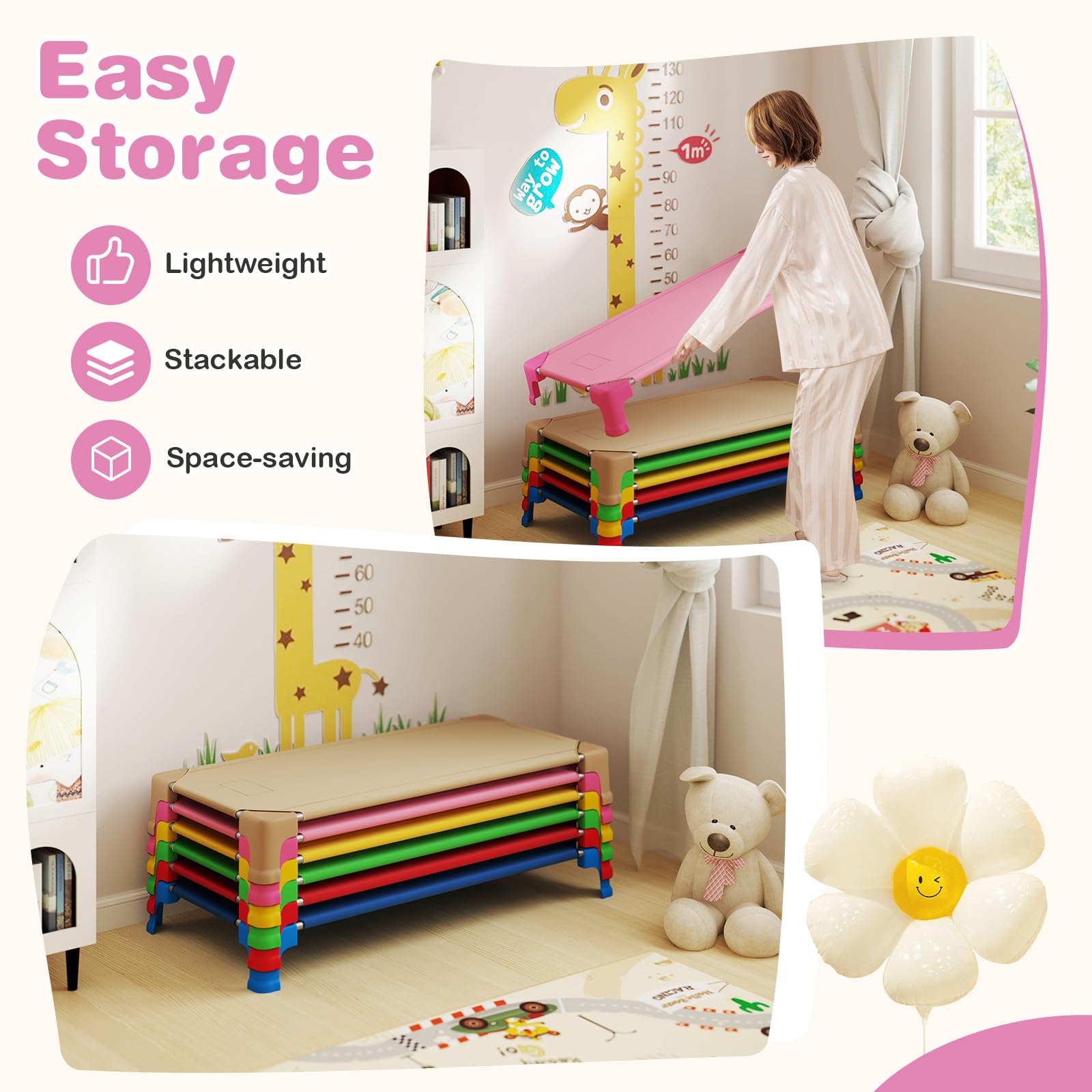 [ Space-Saving Stackable Design ]: The 6-pack toddler cot set can be stacked neatly in a compact vertical arrangement (only 53" x 24" x 17" in stacked size), saving valuable floor space. Lightweight and easy to transport, these cots allow for quick relocation between rooms or classrooms.