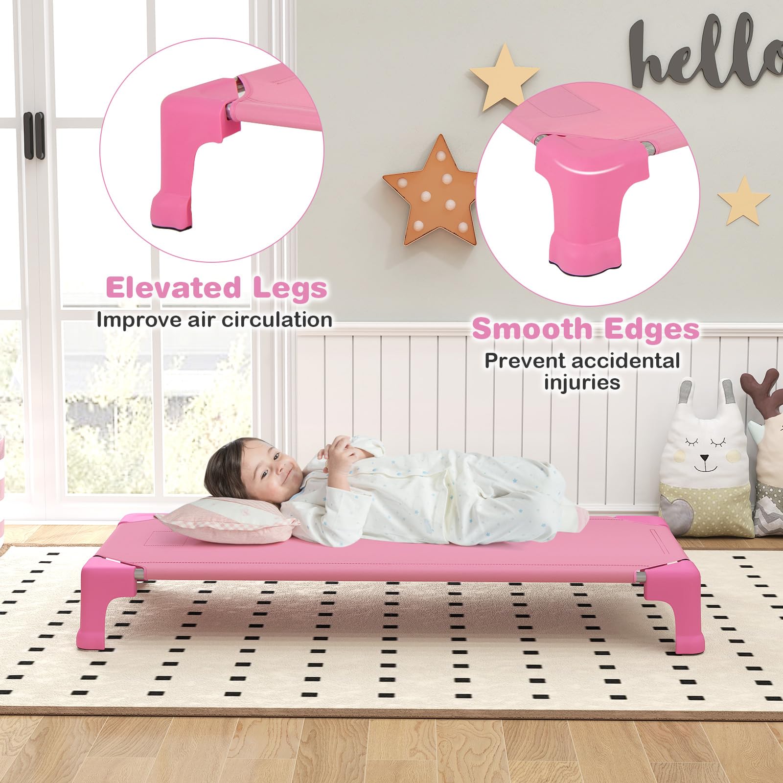 [ Sturdy Metal Frame ]: Crafted with galvanized metal pipes, each sleeping cot ensures stability and durability, supporting up to 132 lbs. Reinforced plastic corners enhance stability by preventing tipping, while non-slip foot pads protect floors from scratches. It's suitable for both preschool kids and pets.