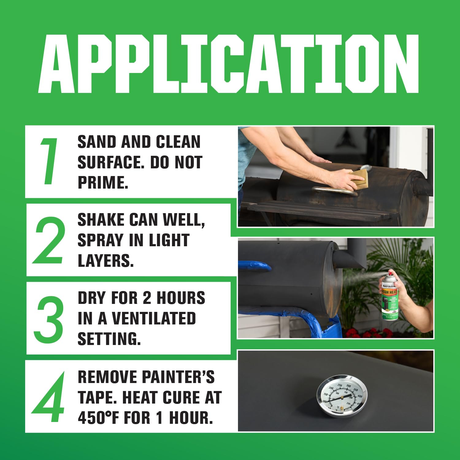 Rust-Oleum High Heat Spray Paint makes your barbecue grill look like new. Specially formulated to resist heat up to 1000ΒΊ F. Resists outdoor weathering and provides rust protection. Apply to grills, wood-burning stoves, radiators, engines or other metal items.