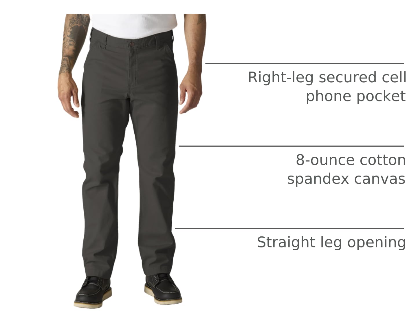 Description This dungaree features a hint of stretch for comfort and a cell phone pocket for functionality. It's made from 8-ounce, 98 percent cotton/2 percent spandex canvas and sits at the waist, has a relaxed seat and thigh, reinforced front slash pocket, belt loops sewn on the seam for strength, right-leg secured cell phone pocket and straight leg opening.