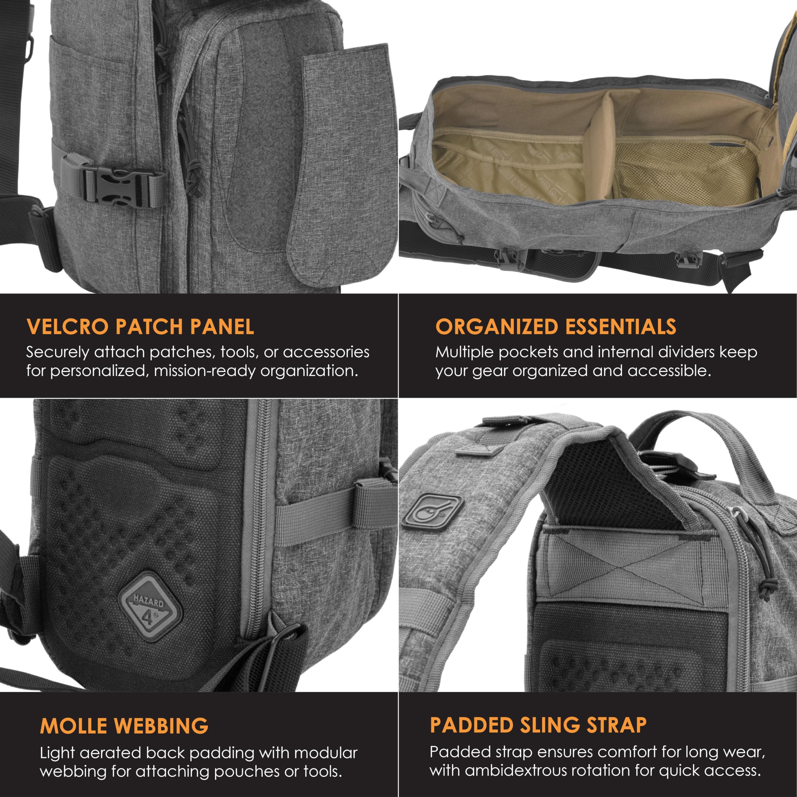 Removable velcro panel on front for modular patches and minor external color-matched molle on shoulder strap for attaching a pouch or two; Rotates from back to chest for quick access.