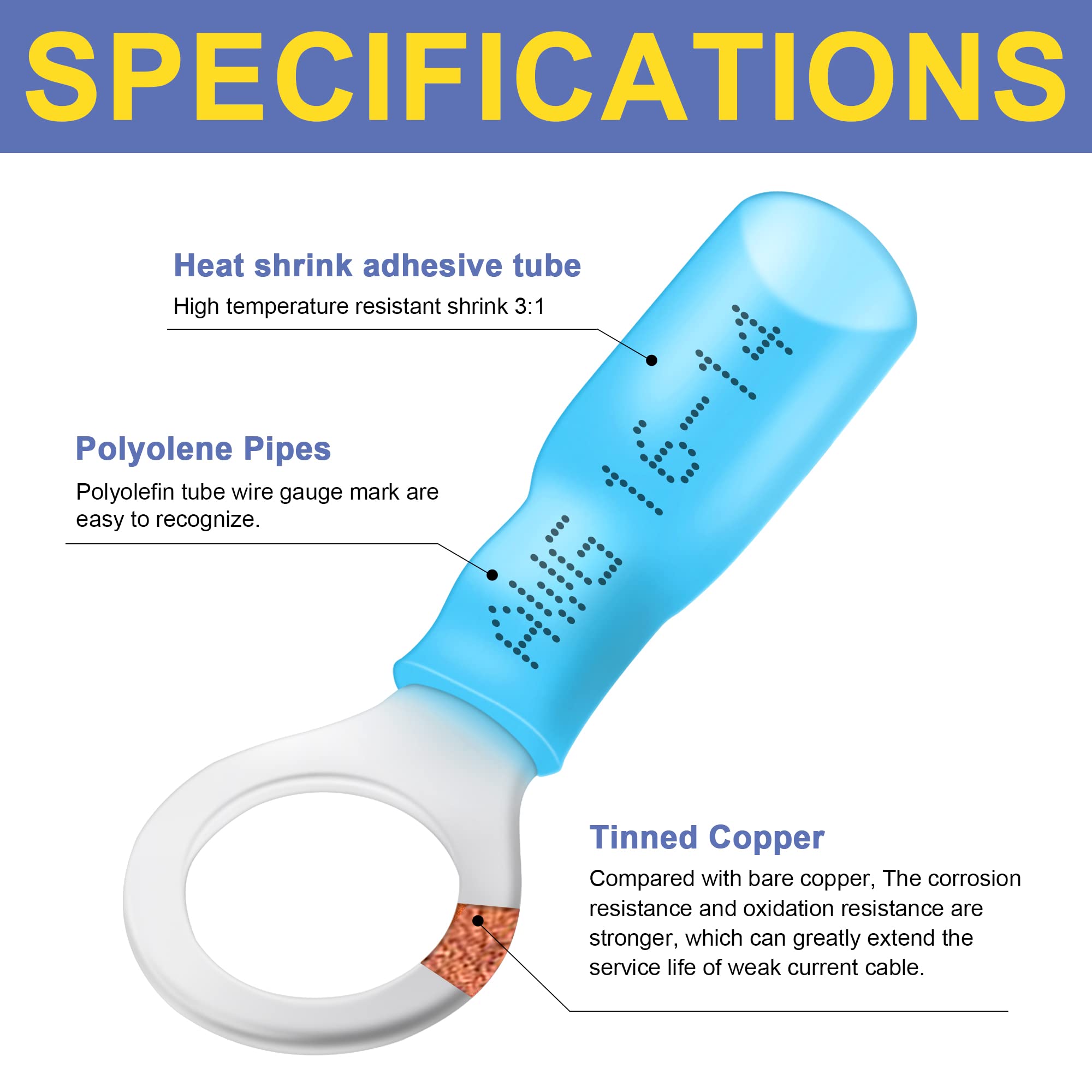 Flexible Application:The 100pcs heat shrink ring terminals work for wire gauge AWG 16-14 3/8".For motorcycles,automobiles,Tractors,boats,etc