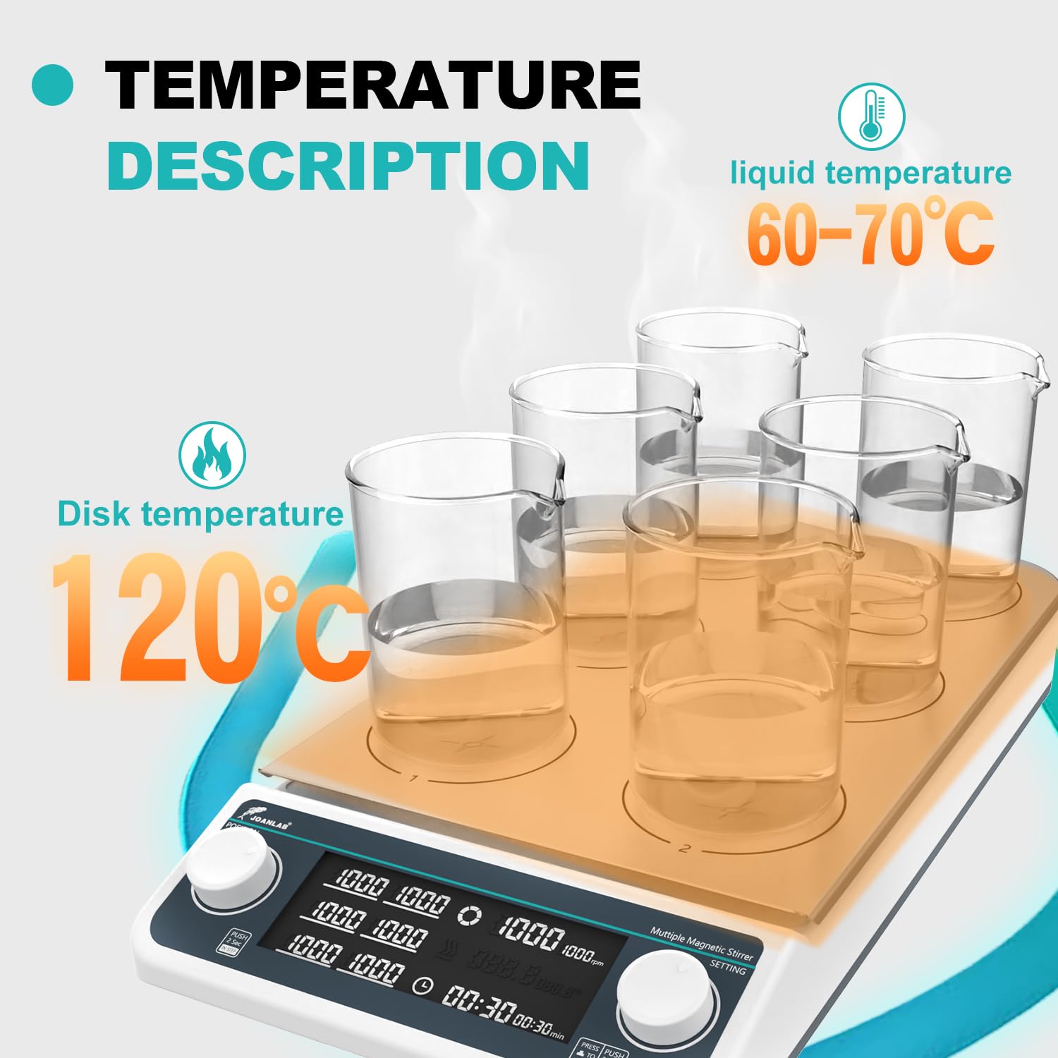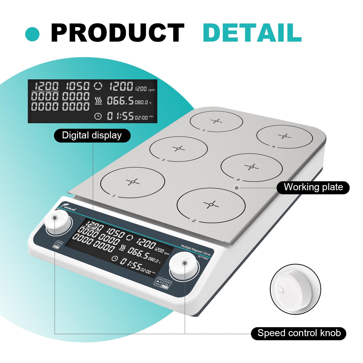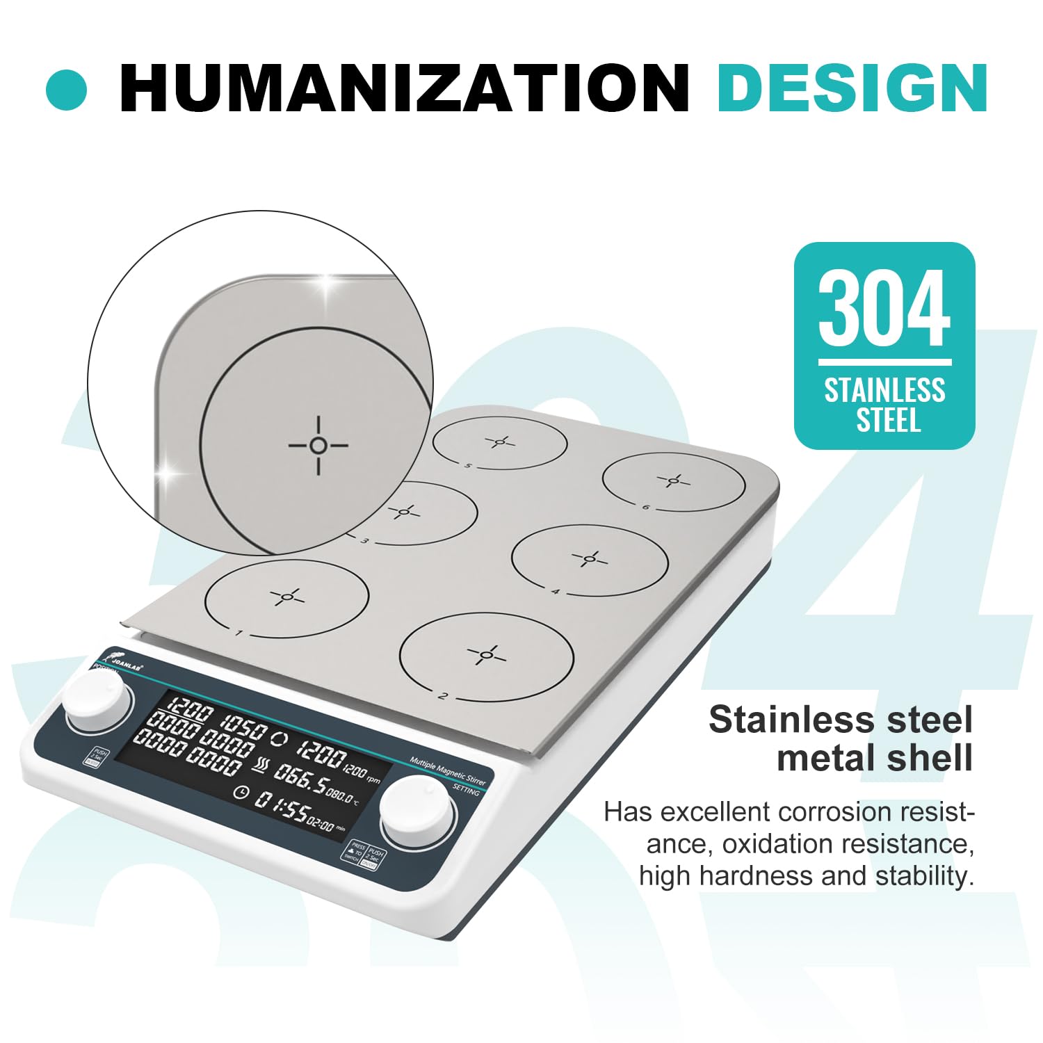 Intelligent Design:LCD liquid crystal display, time and speed of multi-head magnetic stir hot plate can be displayed clear. Lock screen function during operation, parameters will not be modified because of accidental touch, the experiment is safer.