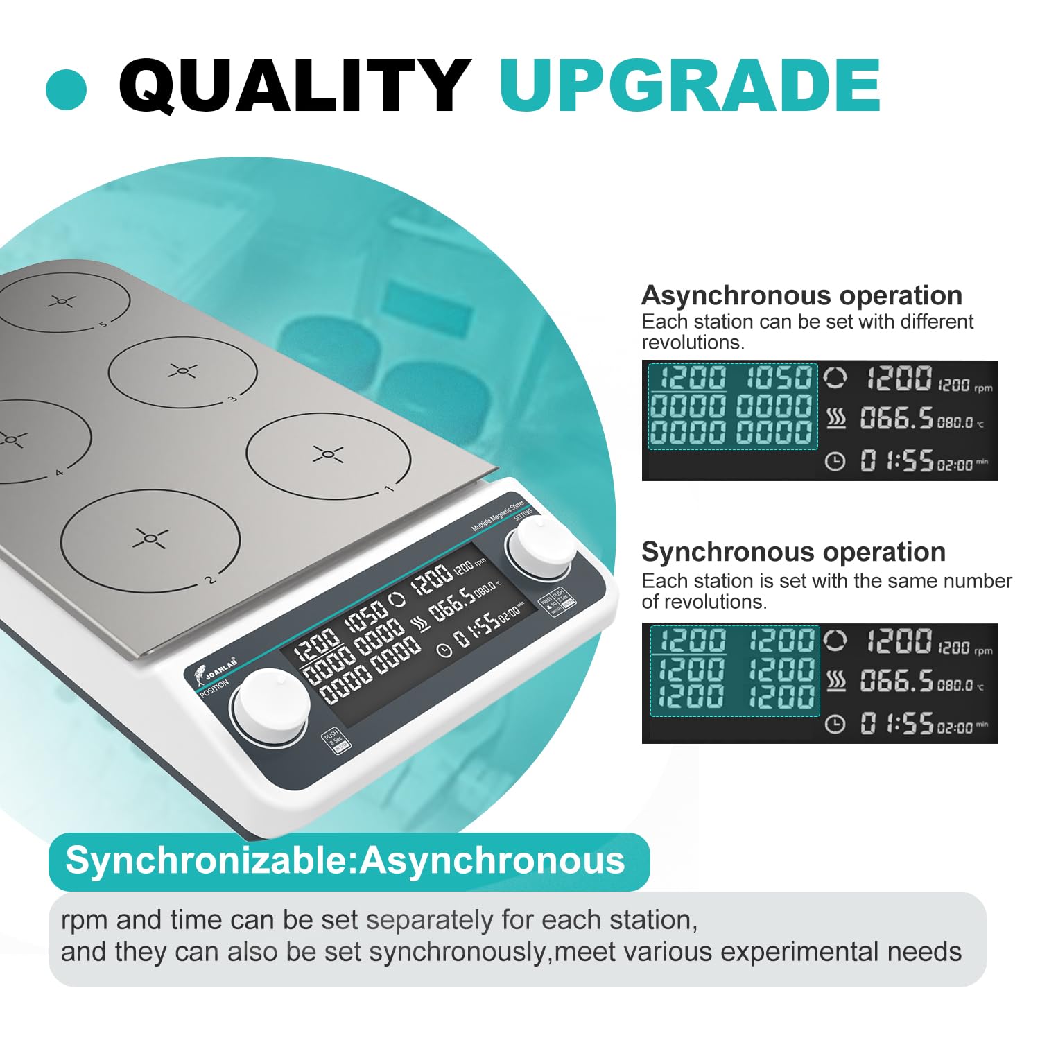 SYNCHRONOUS/ASYNCHRONOUS OPERATION:Speed and time of multi position magnetic stirrer hotplate can be separately for each station ,and the same parameters can be set for collectively. 6 kinds of solutions can be processed simultaneously or independently with lab magnetic multi stirrer, to meet various experimental needs,saving time and effort.